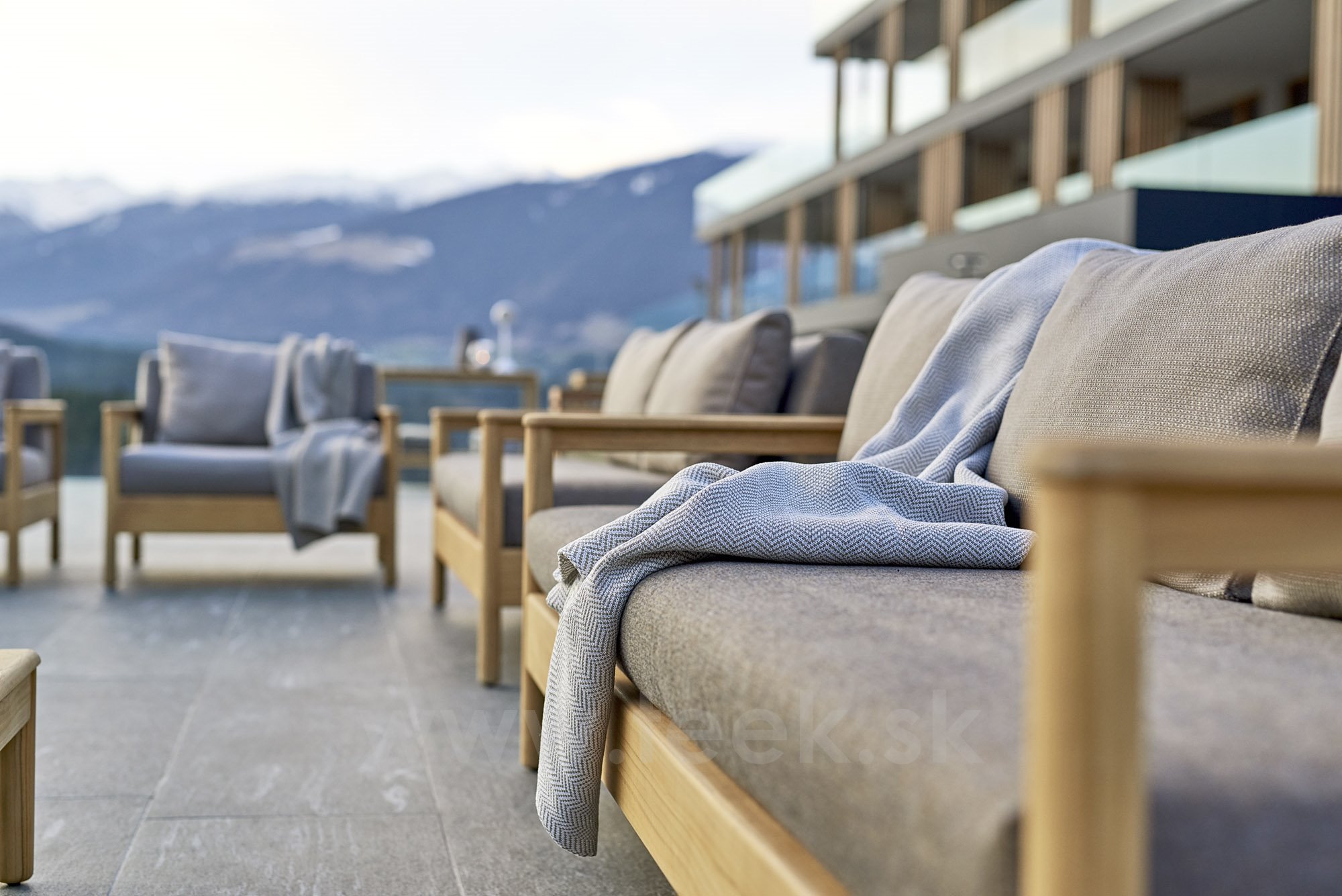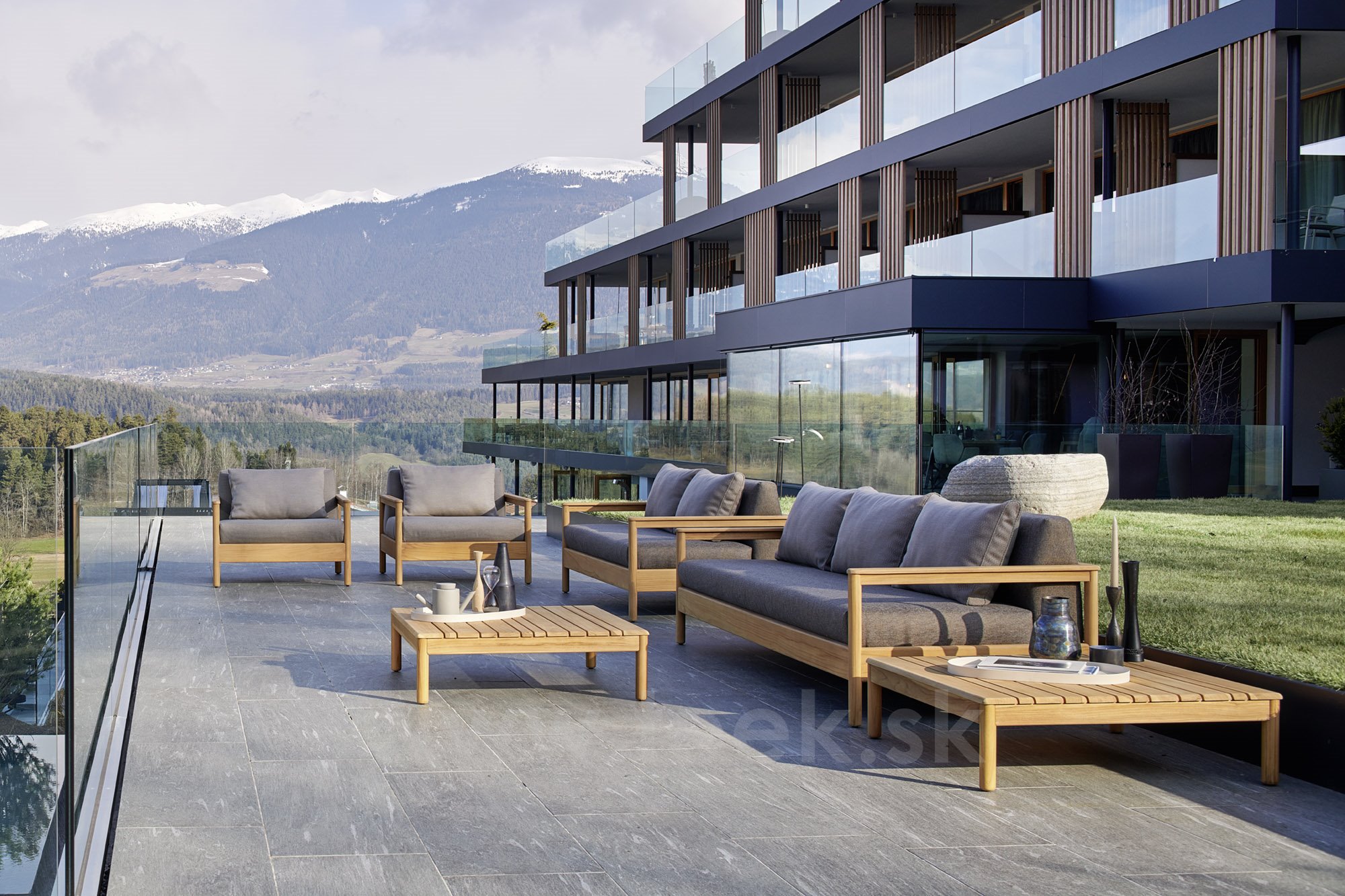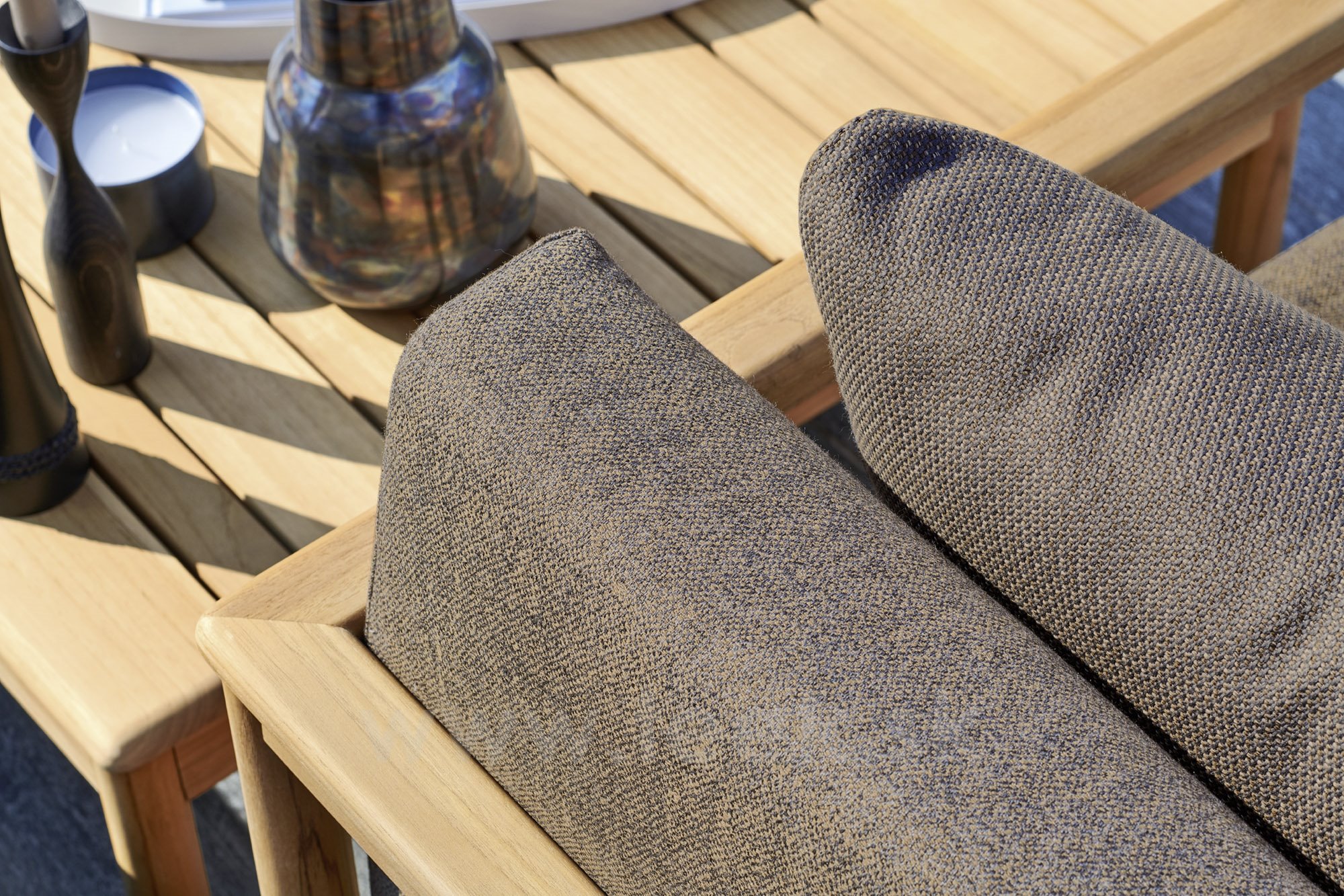 Rám pohovky je vyrobený z teakového dreva, sedacie vankúše sú z outdoorovej tkaniny s rýchloschnúcou výplňou - preto je možné nábytok nechať vonku po celý rok aj s vankúšmi.