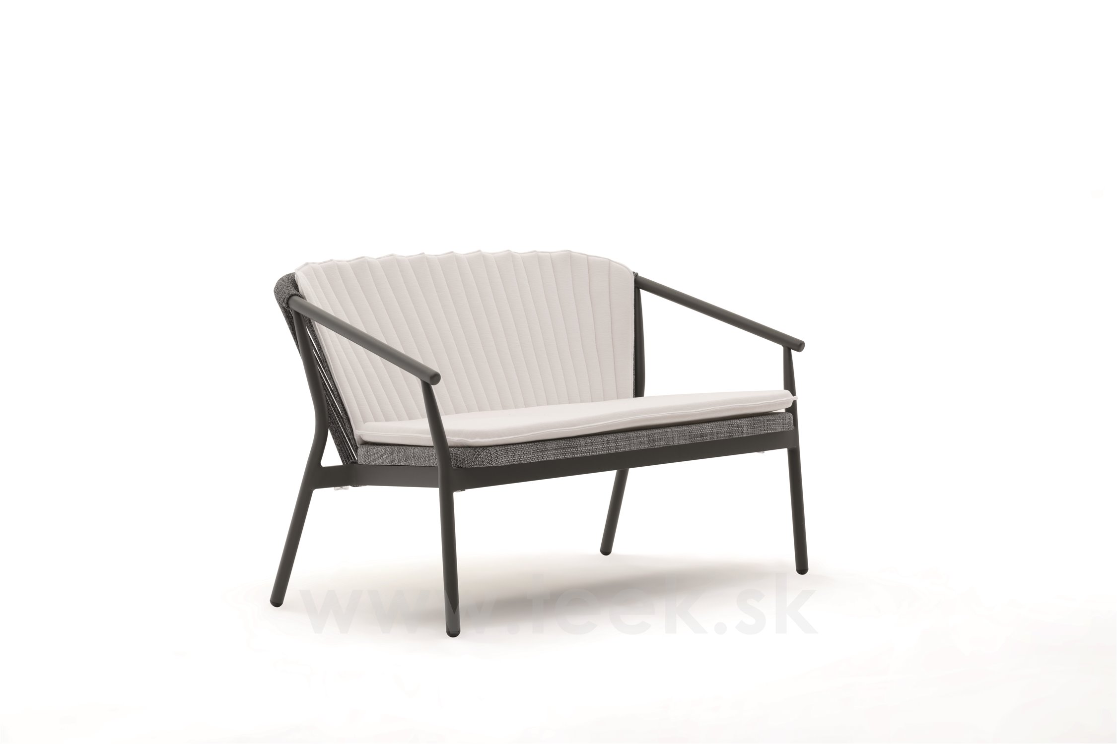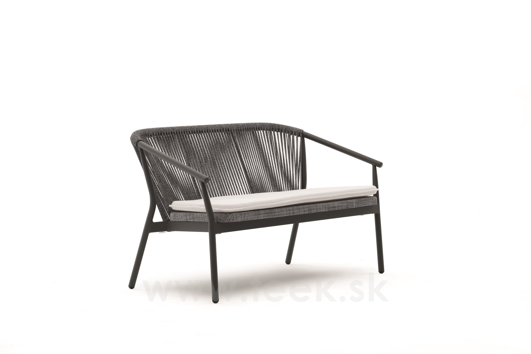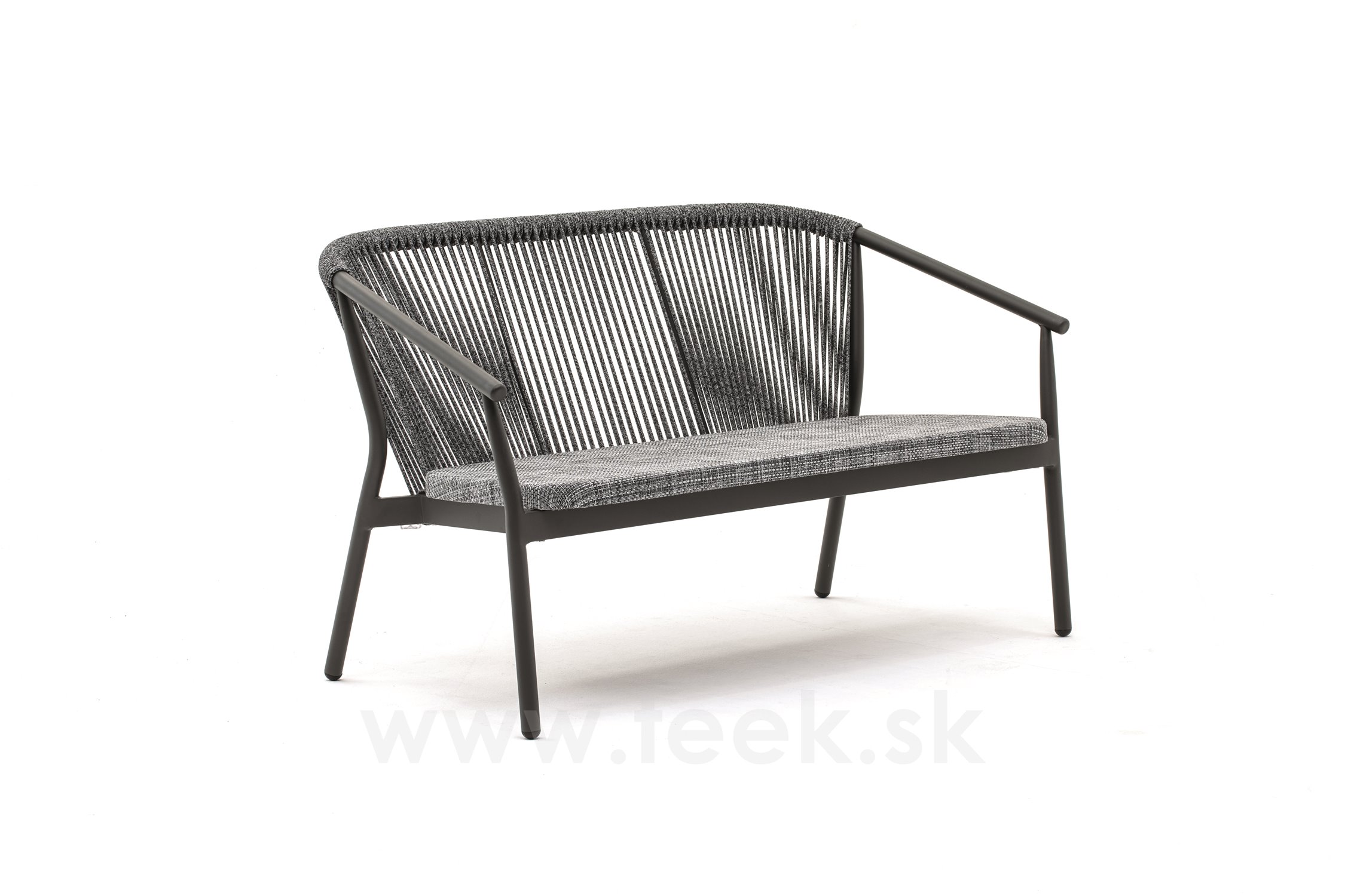 Rám pohovky je vyrobený z lakovaného hliníka, operadlo je vyrobené z káblového výpletu a sedadlo z textilu.