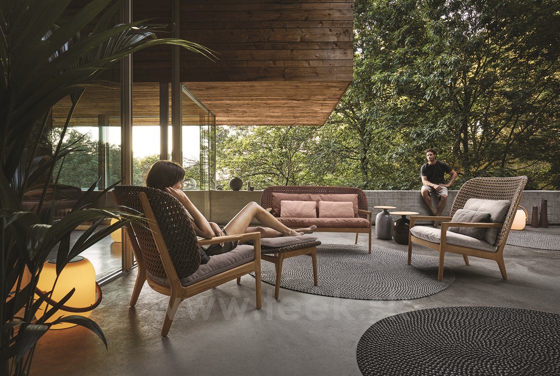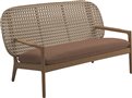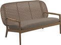 Garden 2-seater sofa Kay by Gloster. The garden sofa has a polished teak frame in combination with a faux rattan weave. The seat is made of outdoor fabrics suitable for year-round use.