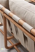 Pohovka má rám z teakového dřeva, které je v sedací části propleteno pásovým výpletem.