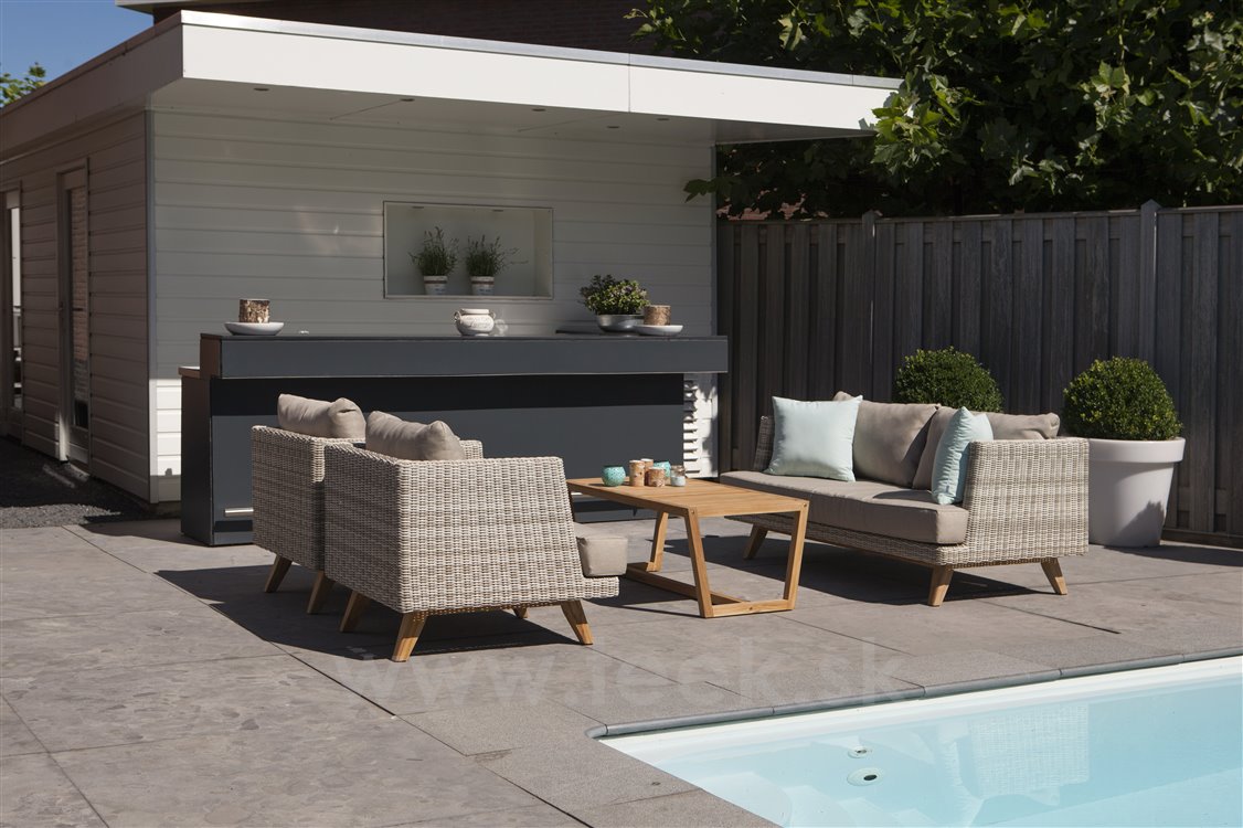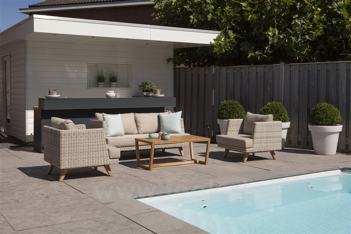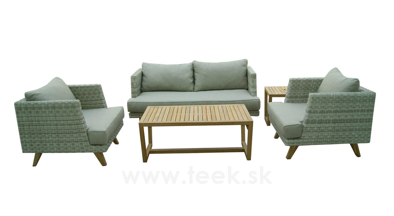 Sedacia súprava má konštrukciu z umelého ratanu a nohy z teakového dreva. Sedacie vankúše sedacej súpravy sú vyrobené z outdoorovej tkaniny s rýchloschnúcou penovou výplňou. Vďaka tomu môže záhradná sedacia súprava zostať vonku po celý rok aj so sedacími vankúšmi bez potreby chrániť ich pred dažďom.