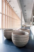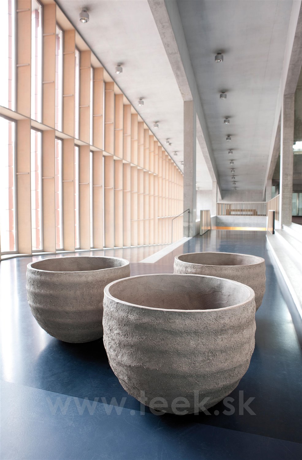 Okrúhle priestranné kvetináče so zaujímavým dekorom.