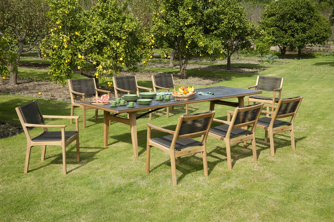 Kolekcia Monterey od spoločnosti Barlow Tyrie. Kolekcia obsahuje jedálenské stoličky a jedálenské stoly. Jedálenská stolička má teakový rám a káblový výplet. Jedálenské stoly majú teakový rám a keramickú dosku.