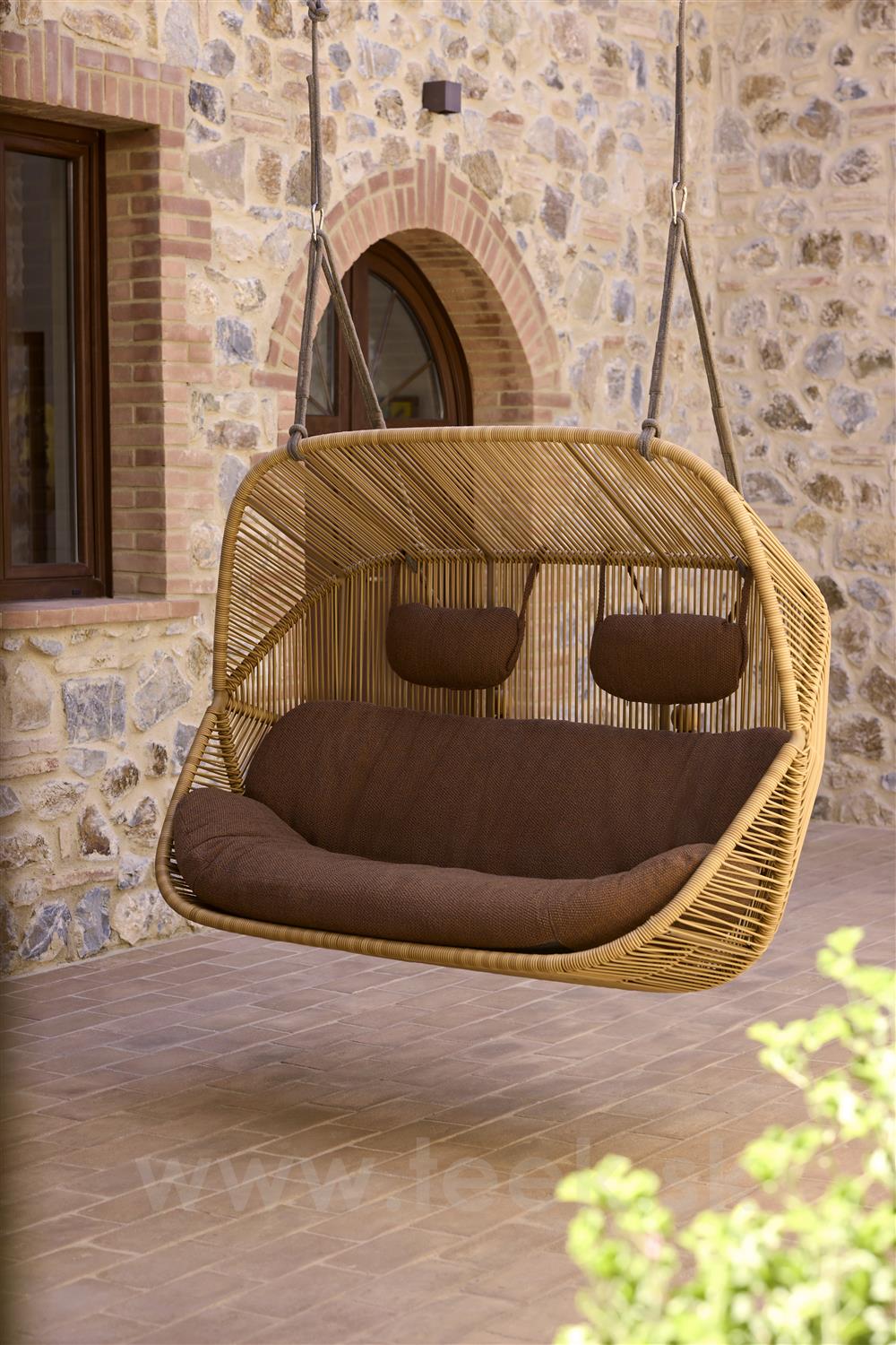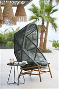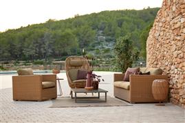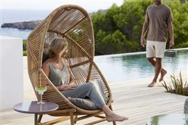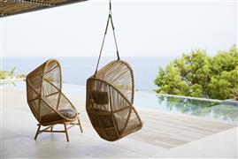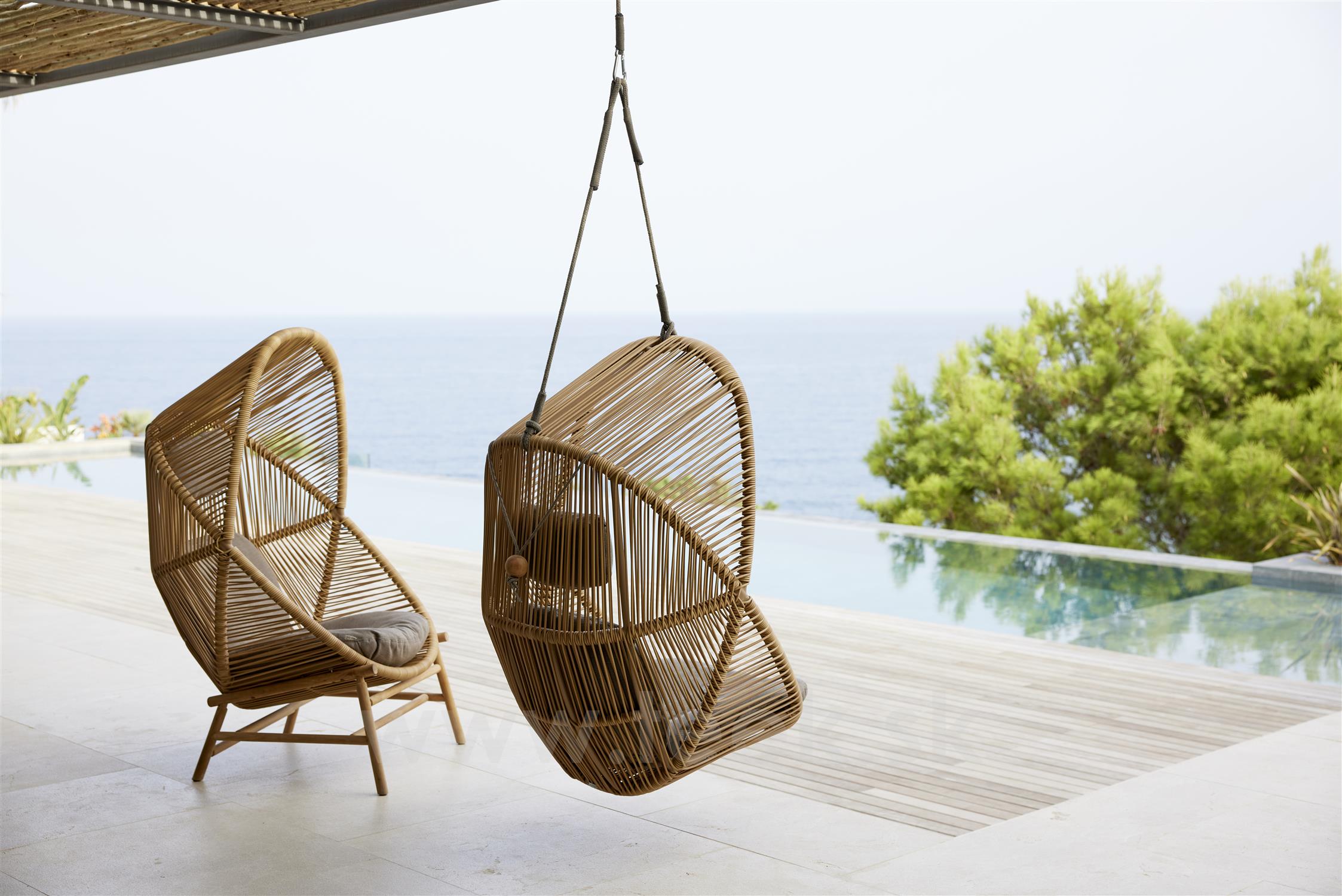 Dizajnové relaxačné kreslá Hive od Cane-line. Nízke aj hojdacie kreslá z umelého ratanu.
