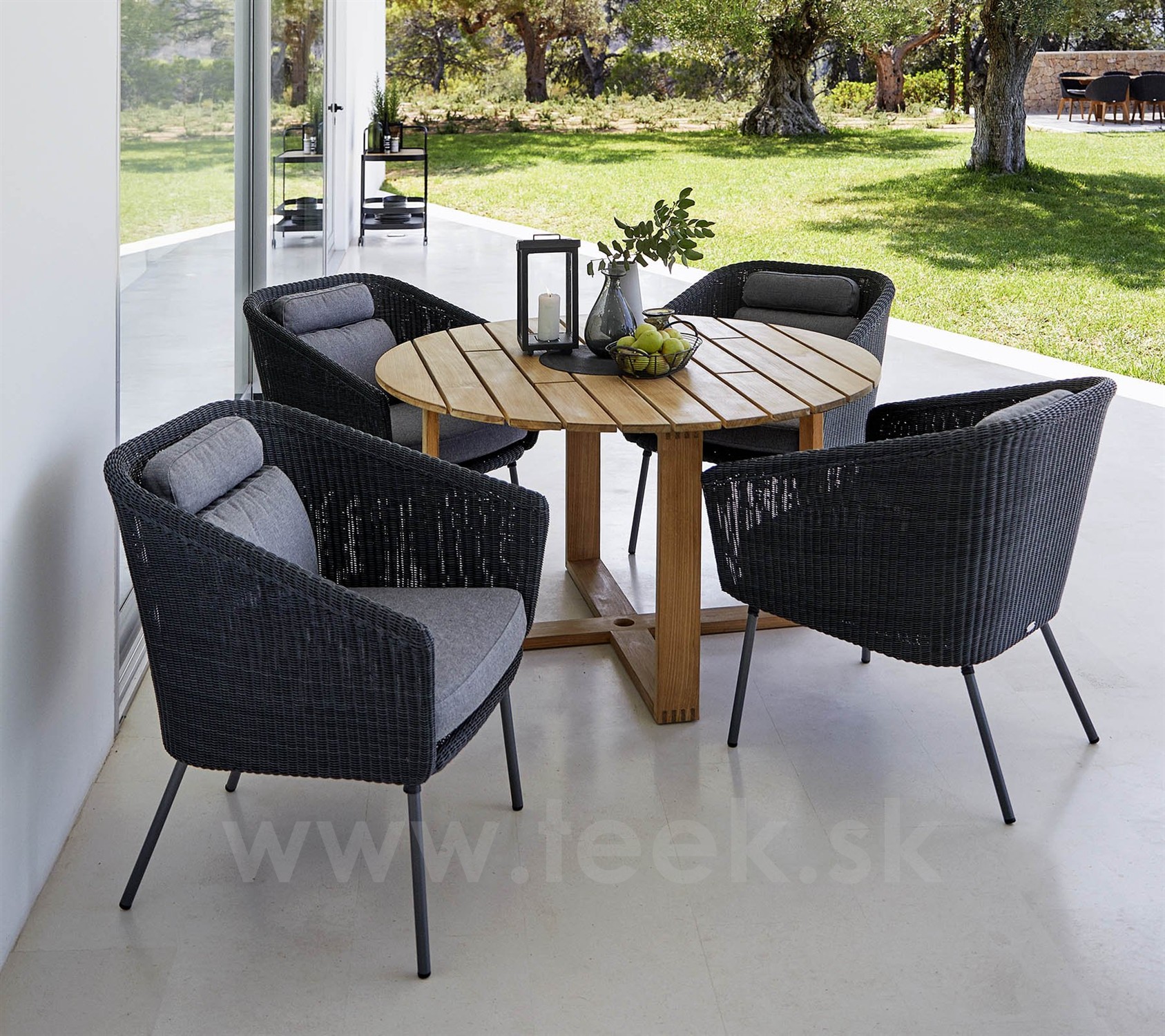 Komfortný vonkajší jedálenský nábytok Mega značky Cane-line. Dá sa kombinovať so sedacím Mega Lounge alebo relaxačným Mega Relax nábytkom z rovnakej kolekcie.