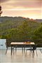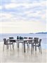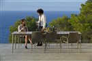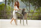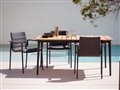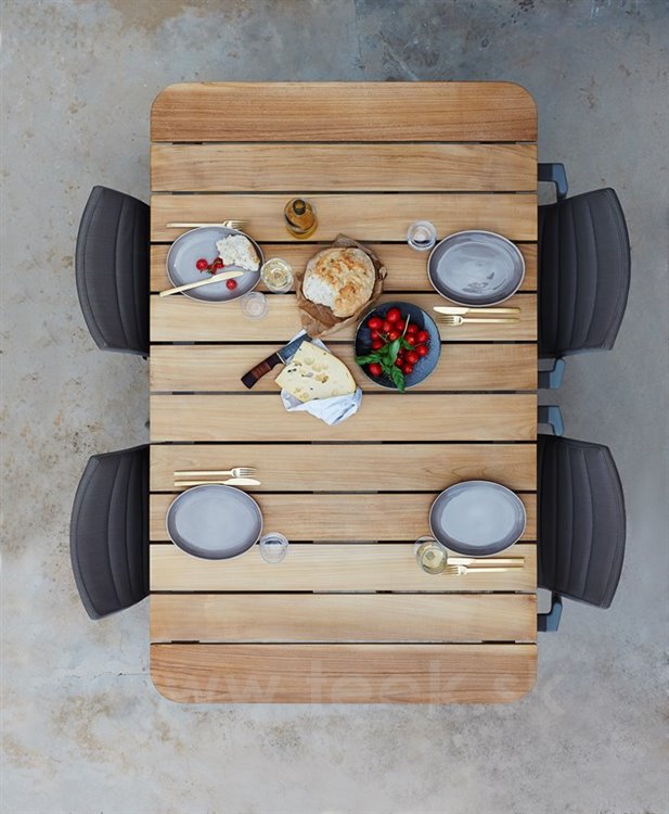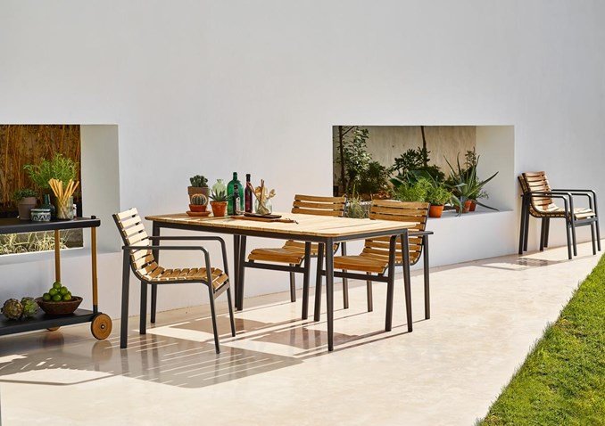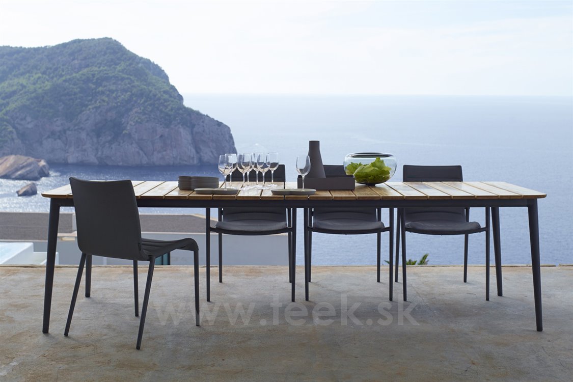 Vonkajšie stoly a stoličky z hliníka a teakového dreva.