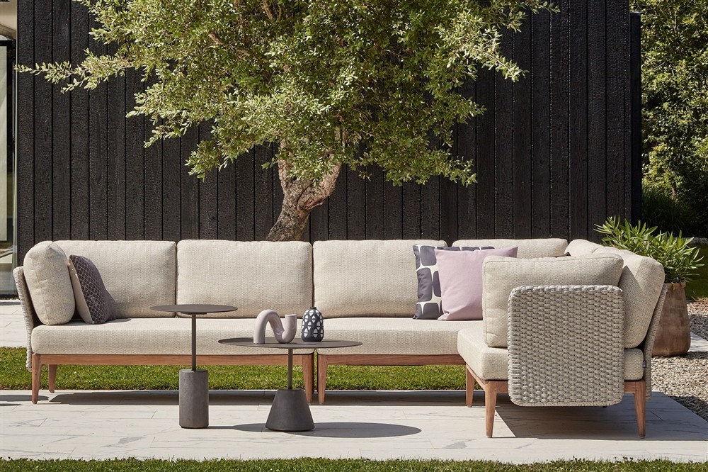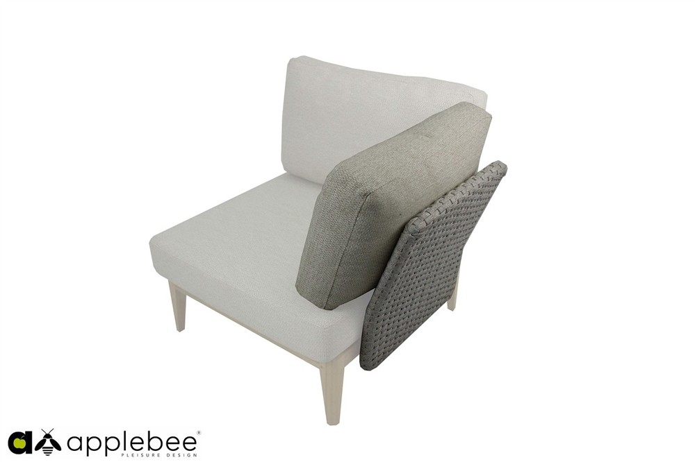 Venkovní modulová sedací sestava z přírodního teaku s lankovým výpletem od značky Apple Bee. Díky flexibilním opěrkám lze z dílů vytvořit nekonečně mnoho kombinací.