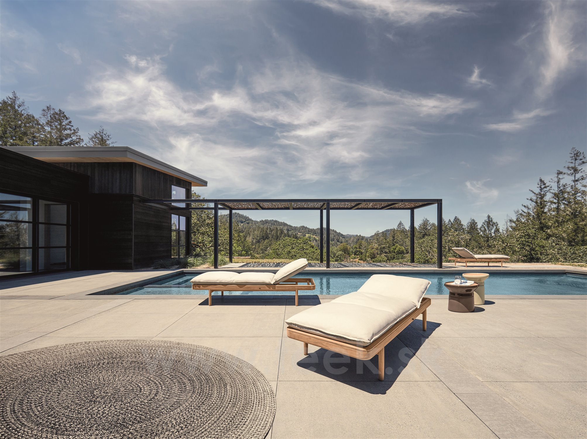 Venkovní nábytek z teakového masivního dřeva Saranac značky Gloster. Kolekce Saranac kombinuje masivní teakové dřevo s lankovým výpletem a polstry z venkovních látek, které jsou velmi odolné, dobře se čistí a rychle schnou. Kolekce Saranac je určena pro celoroční použití.