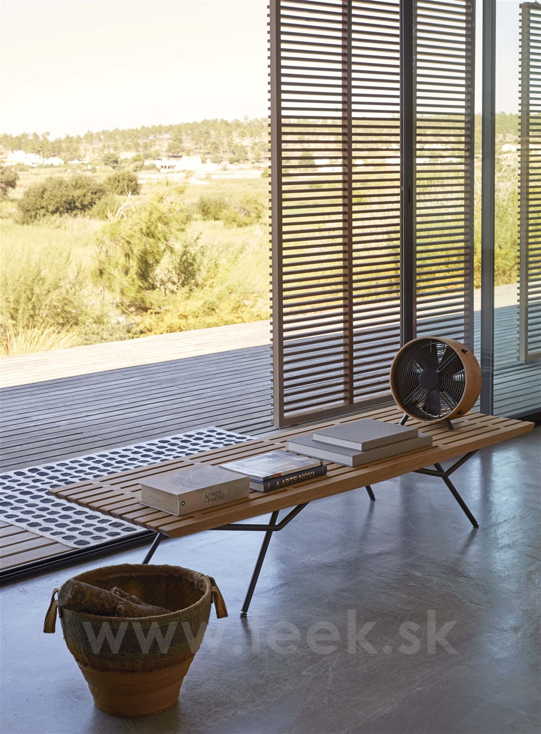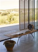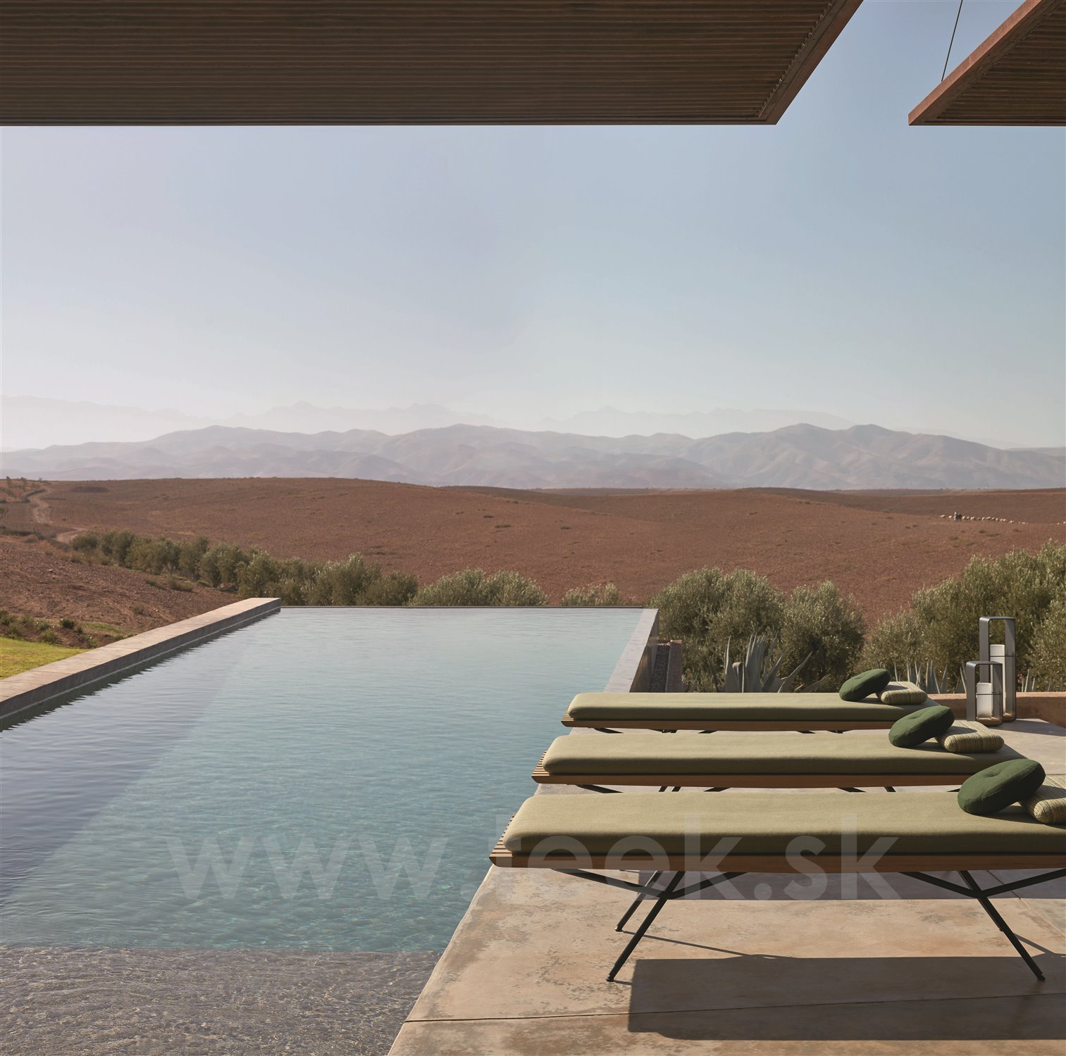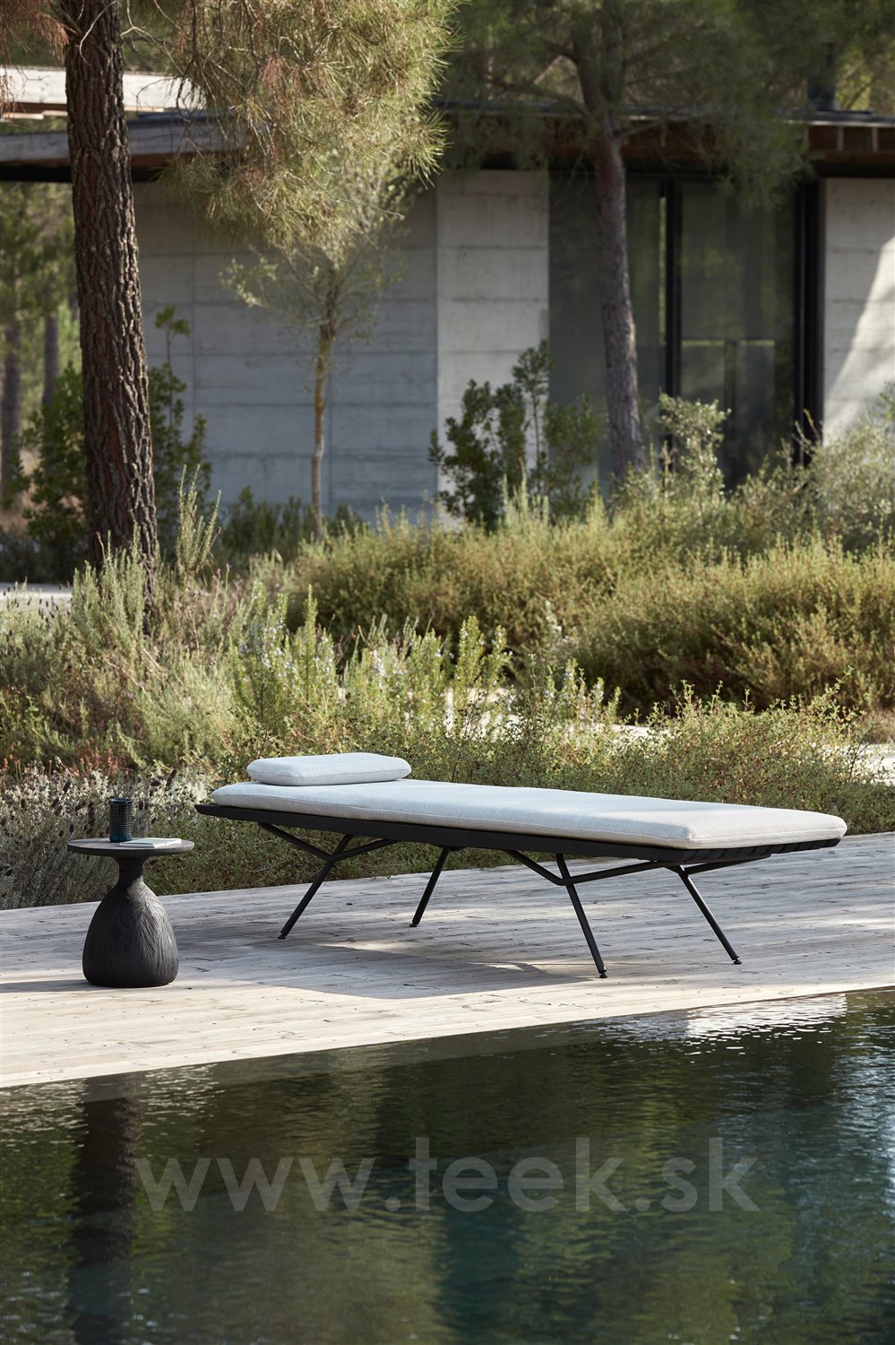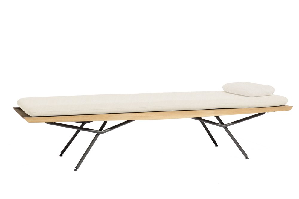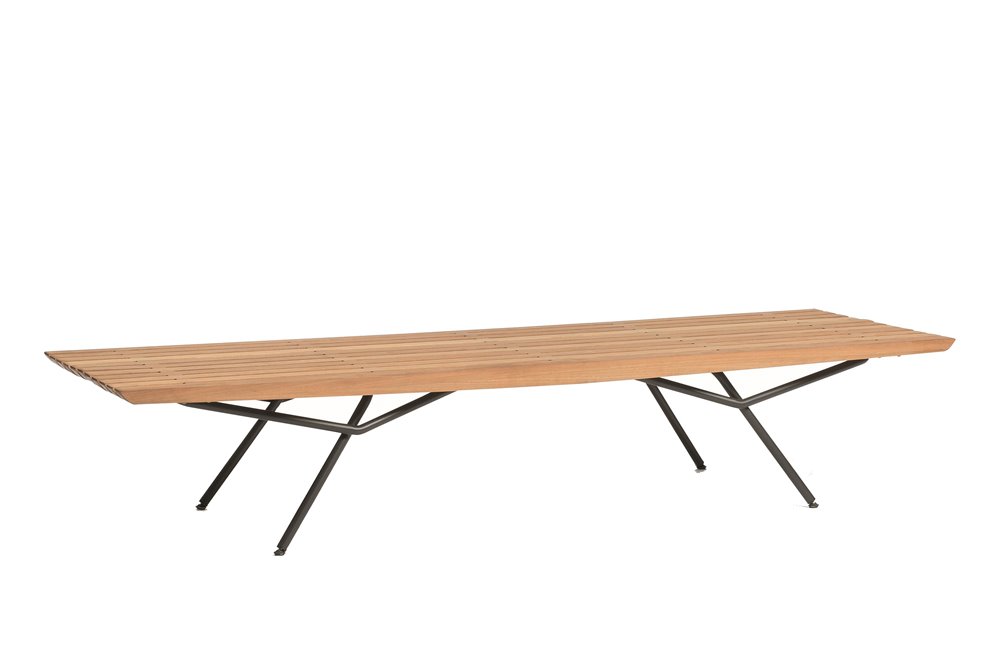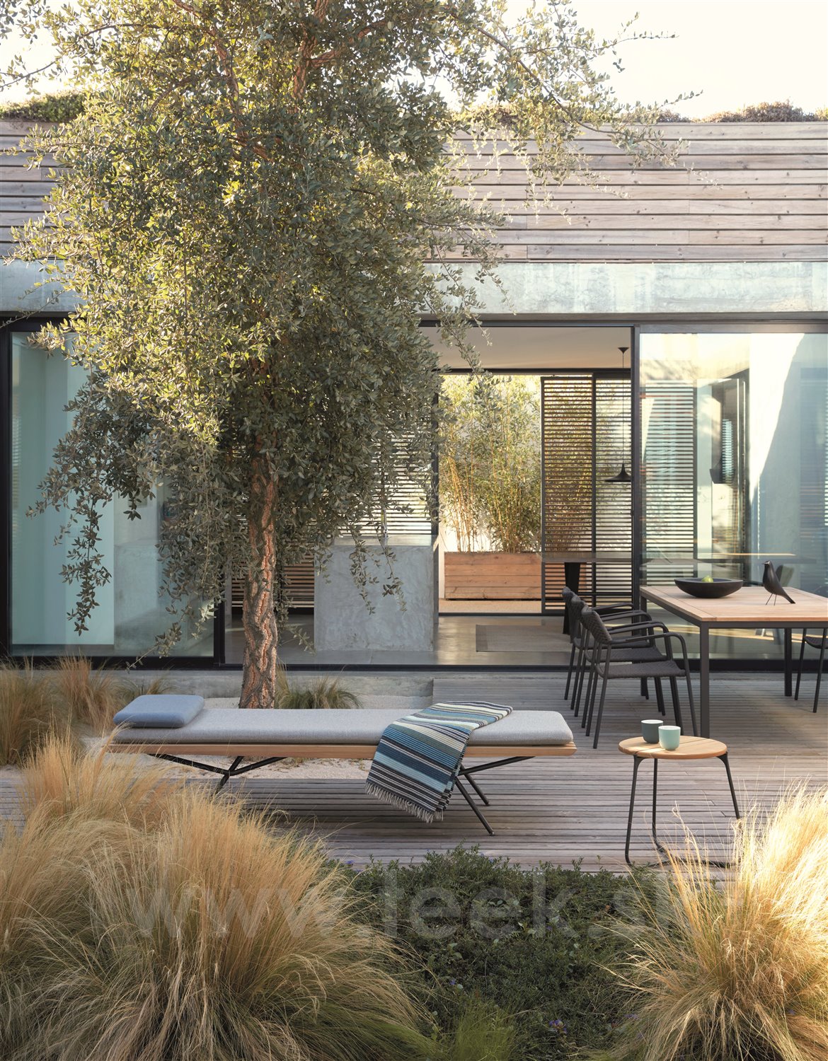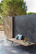 Outdoor bench and lounger made of teak wood with outdoor seats.