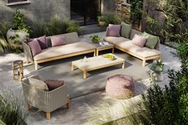 Rám pohovky je z teakového dřeva, opěrka je z umělého ratanu.