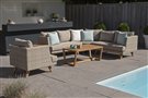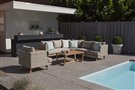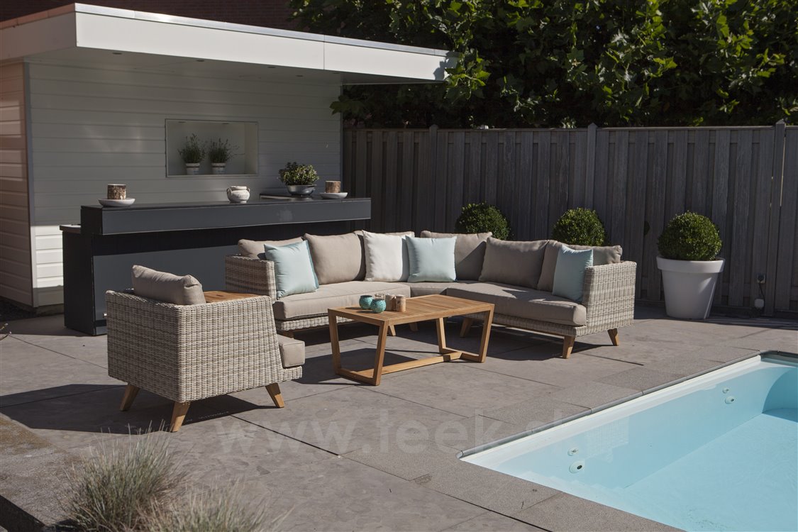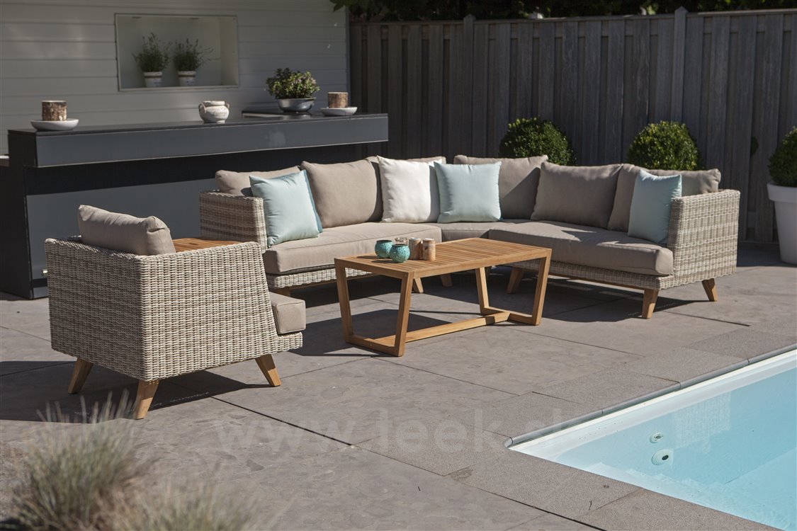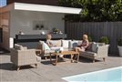 Nízké zahradní křeslo z umělého ratanu Arosa značky Persoon. Relaxační křeslo má konstrukci z umělého ratanu a nohy z teakového dřeva. Sedáky křesla jsou z venkovní akrylové látky Sunbrella s výplní z rychleschnoucí pěny. Díky tomu může křeslo zůstat celoročně venku i se sedáky, bez nutnosti chrátnit je před deštěm.