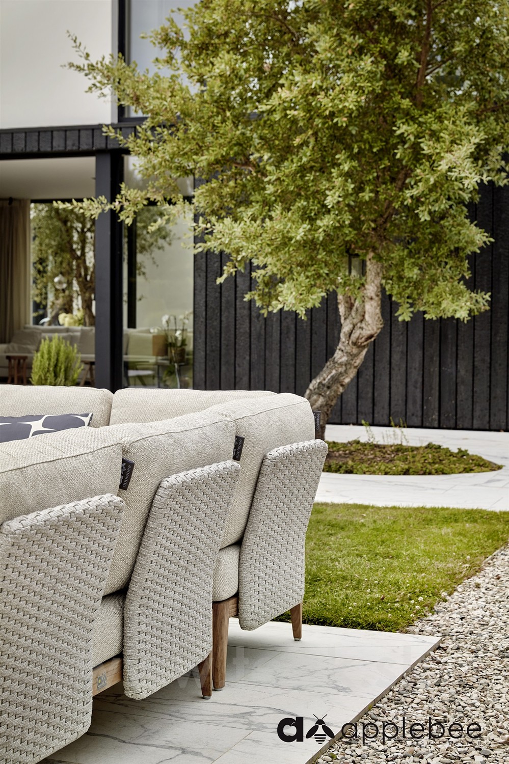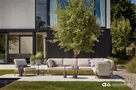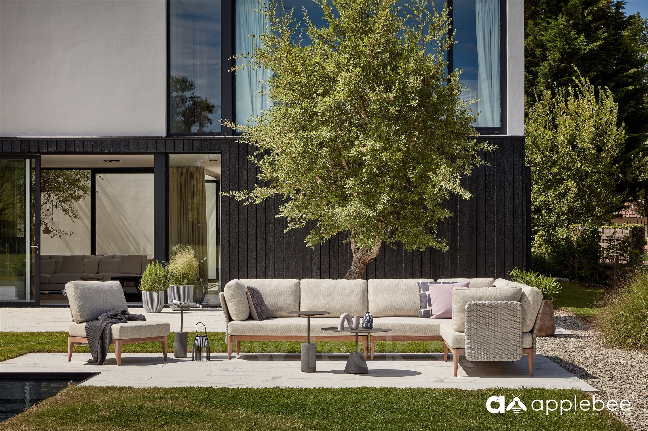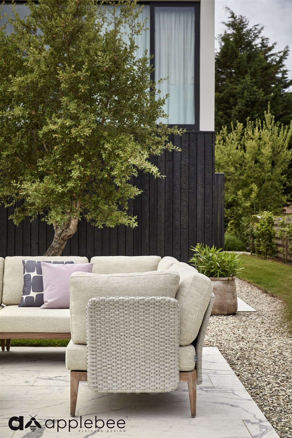 Rohová sedacia zostava 3-dielna Lisa, Apple Bee, ca 300x240 cm, rám teak Natural, výplet lanko Natural Oak, sedáky vonkajšia látka Olefin Natural Oak