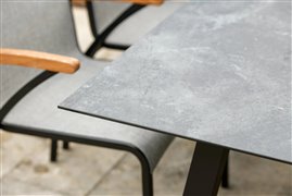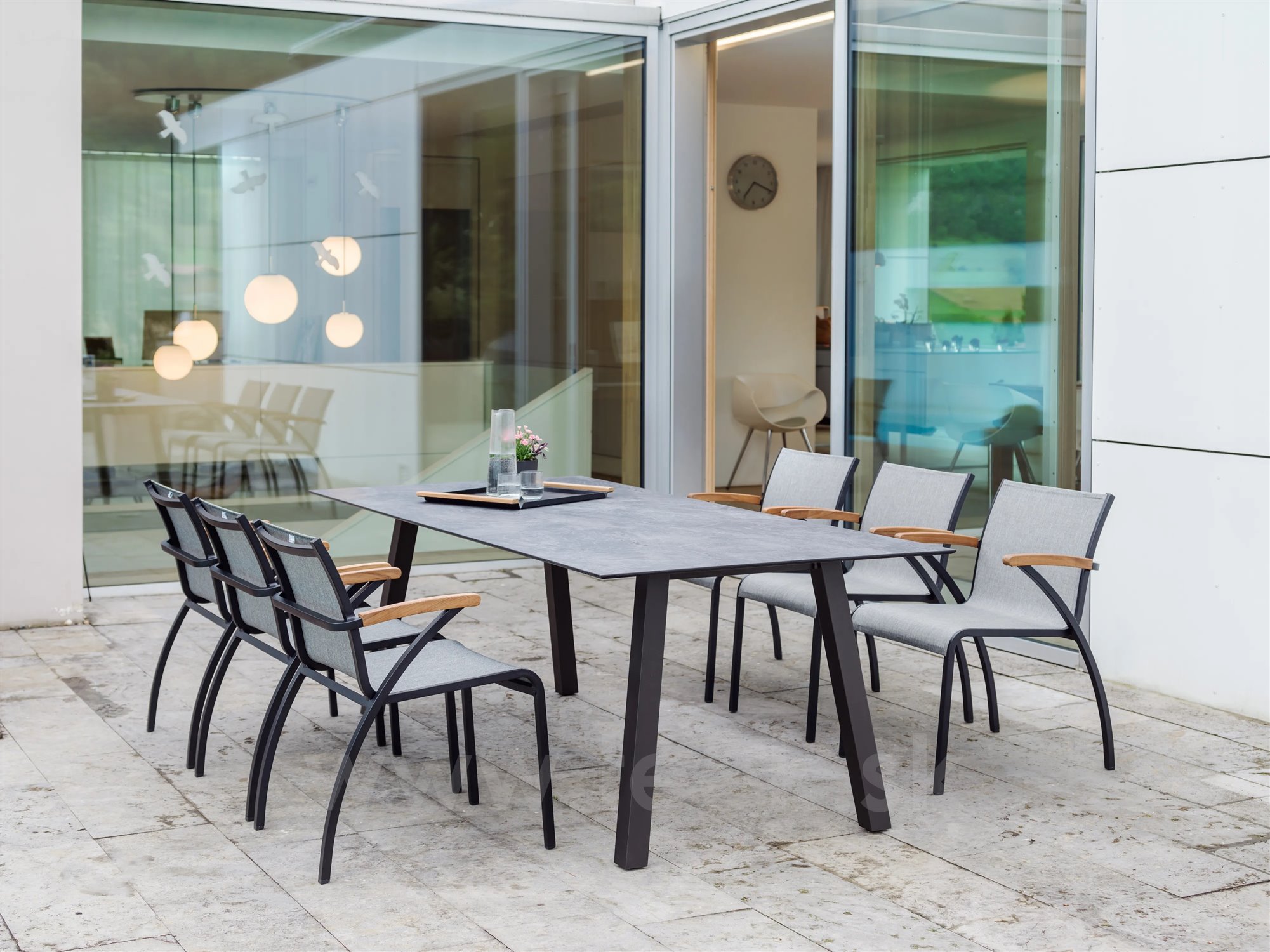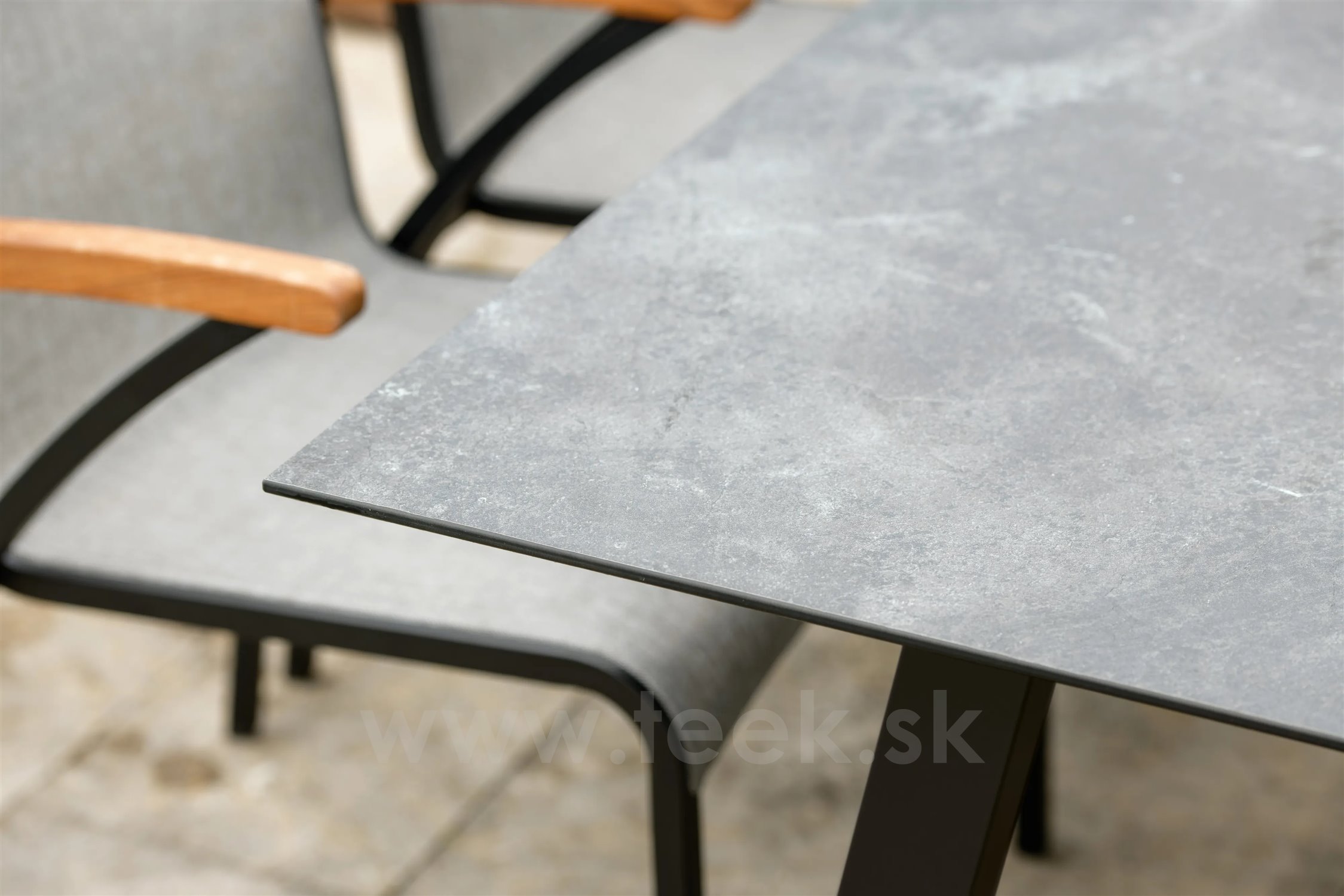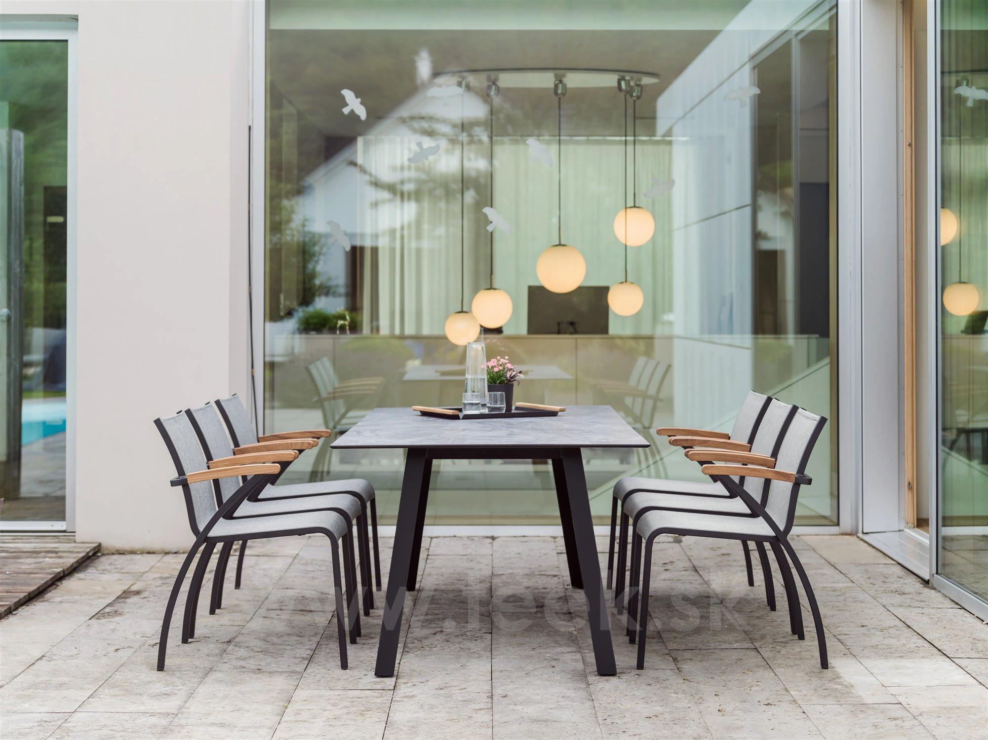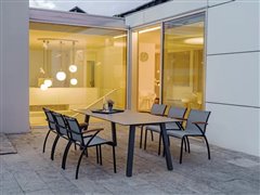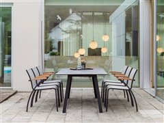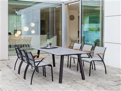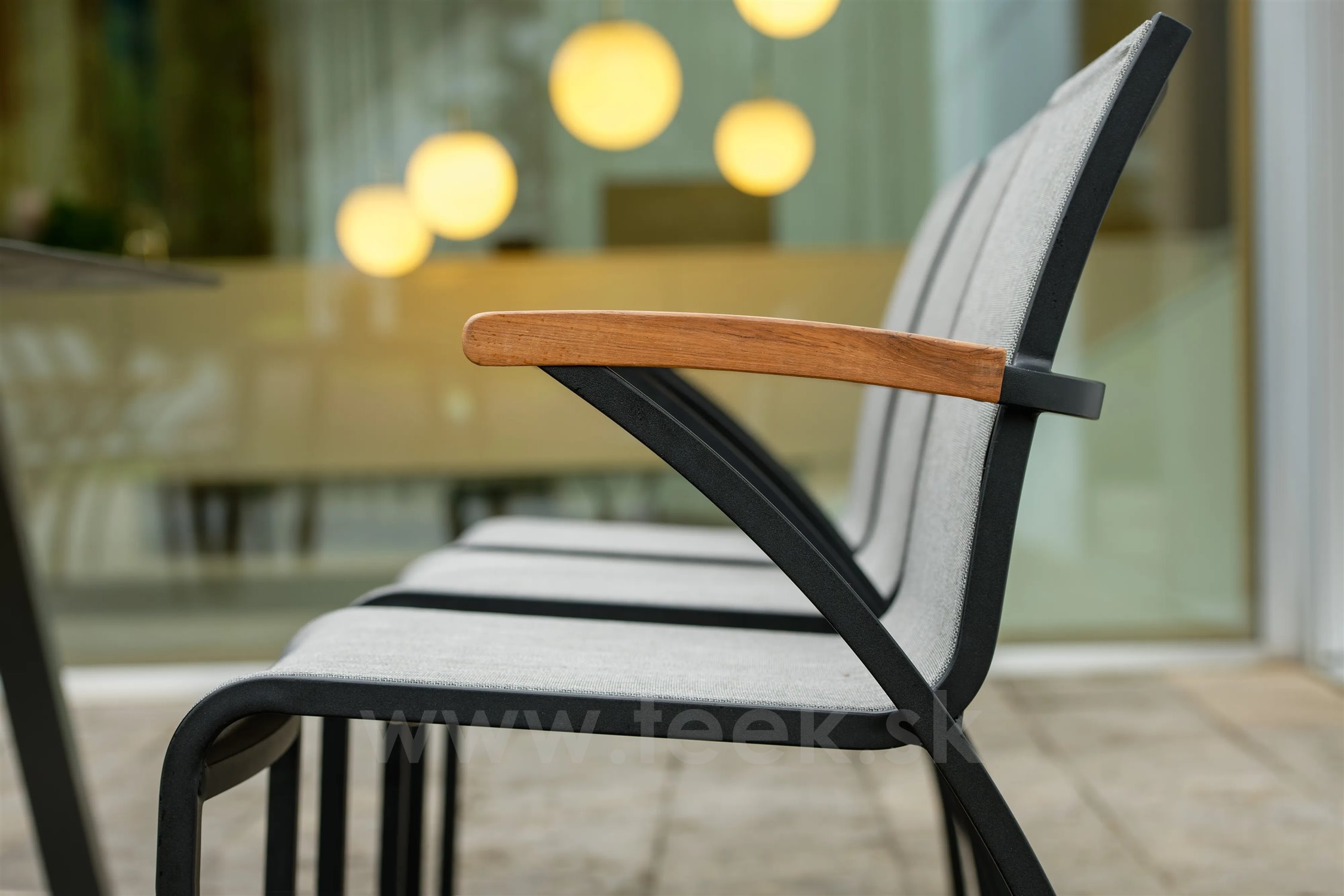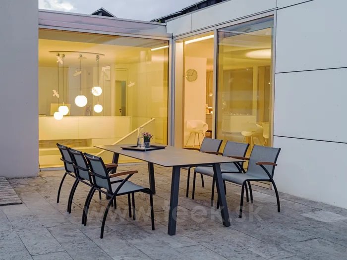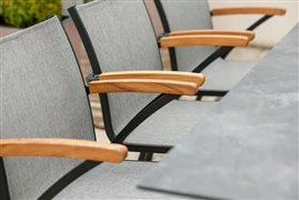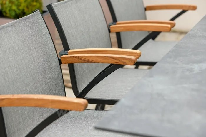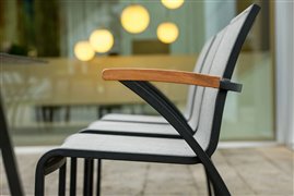 Venkovní jídelní křesla z lakovaného hliníku a teakového dřeva.
