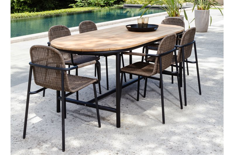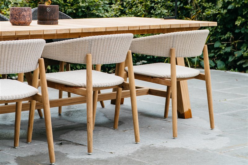 Jedálenská stolička z umelého ratanu s teakovými alebo hliníkovými nohami.