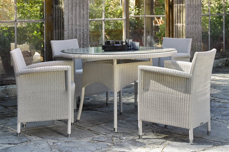 Nadčasové jedálenské kreslá z umelého ratanu.