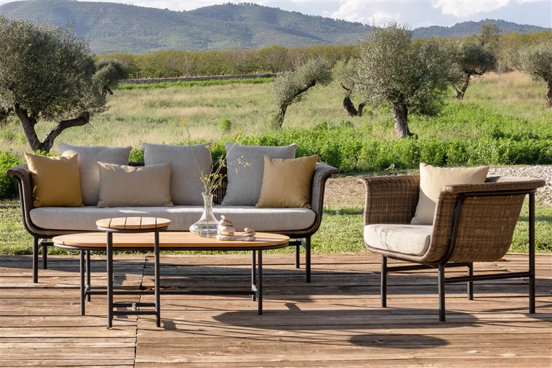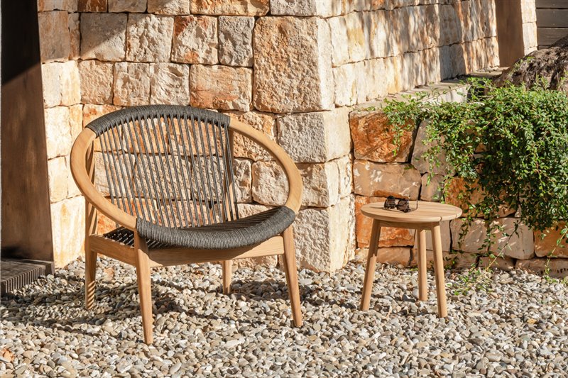 Dizajnová sedacia súprava spájajúca teakové drevo a lanový výplet.