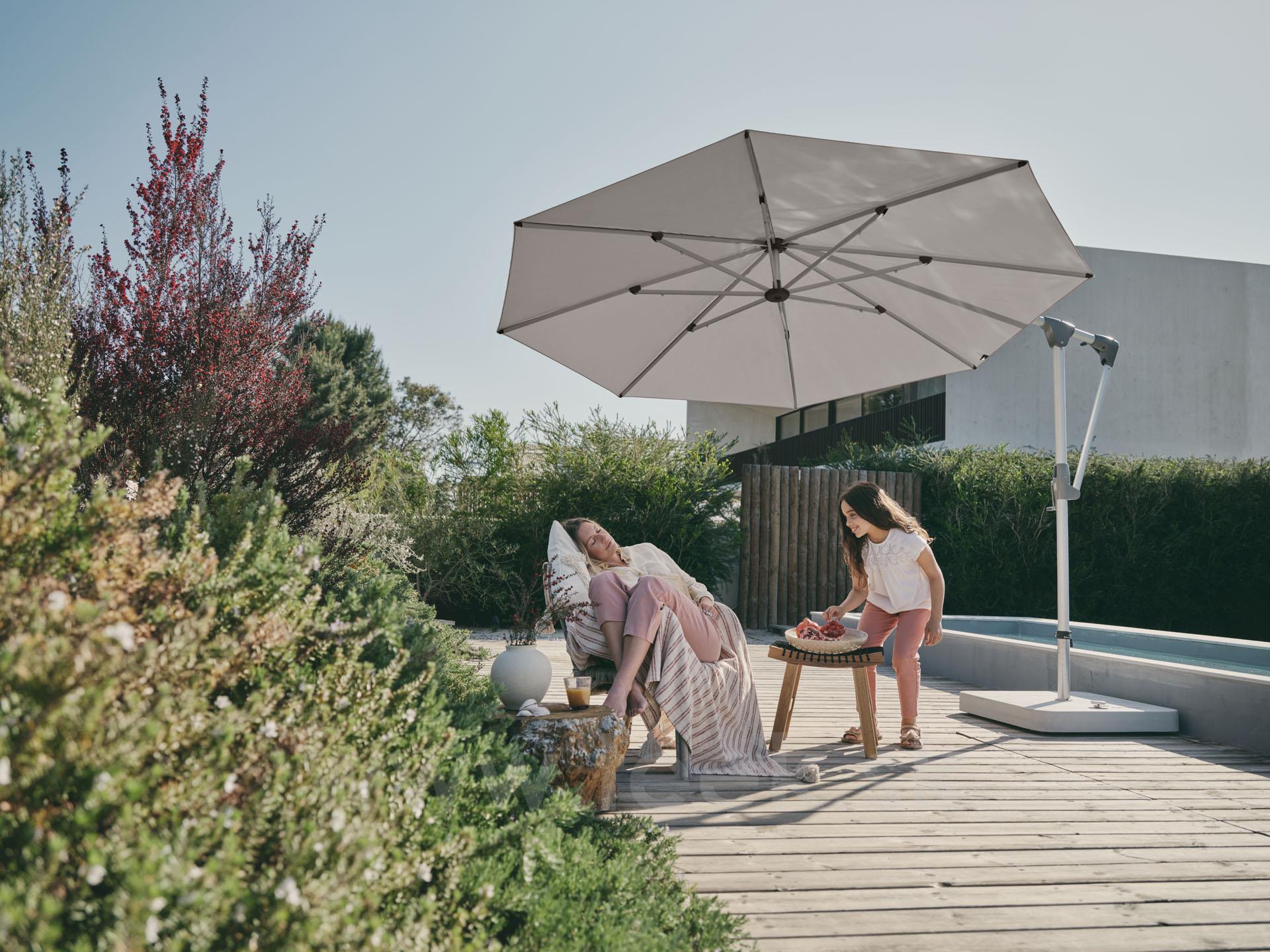 Bočný slnečník SUNWING® CASA od švajčiarskej značky Glatz možno nakloniť horizontálne do uhla 45° na oboch stranách a je otočný okolo svojej osi o celých 360°. Ľahko sa s ním manipuluje a je kompaktný. Samočinné spojky zabezpečujú bezchybné vypnutie poťahu počas celej životnosti slnečníka a poťahu. Na slnečníky Glatz sa vzťahuje záruka, popredajný servis a náhradné diely.