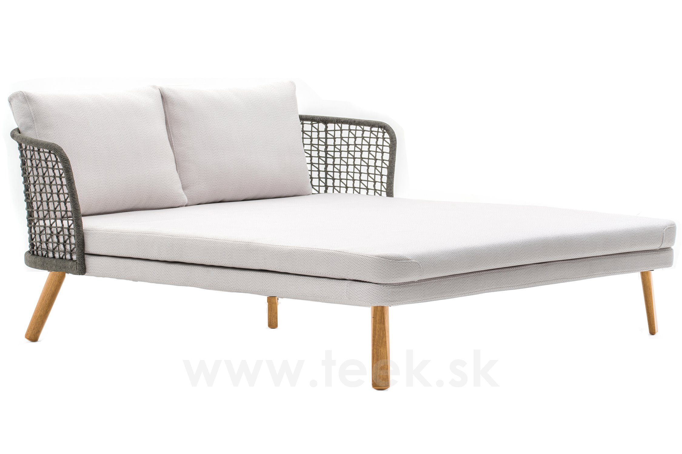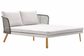 - káblový úplet, - nohy z tropického dreva (iroko), - vankúše na sedenie a operadlo z vonkajšej tkaniny s rýchloschnúcou výplňou. Farby všetkých materiálov podľa vášho výberu.