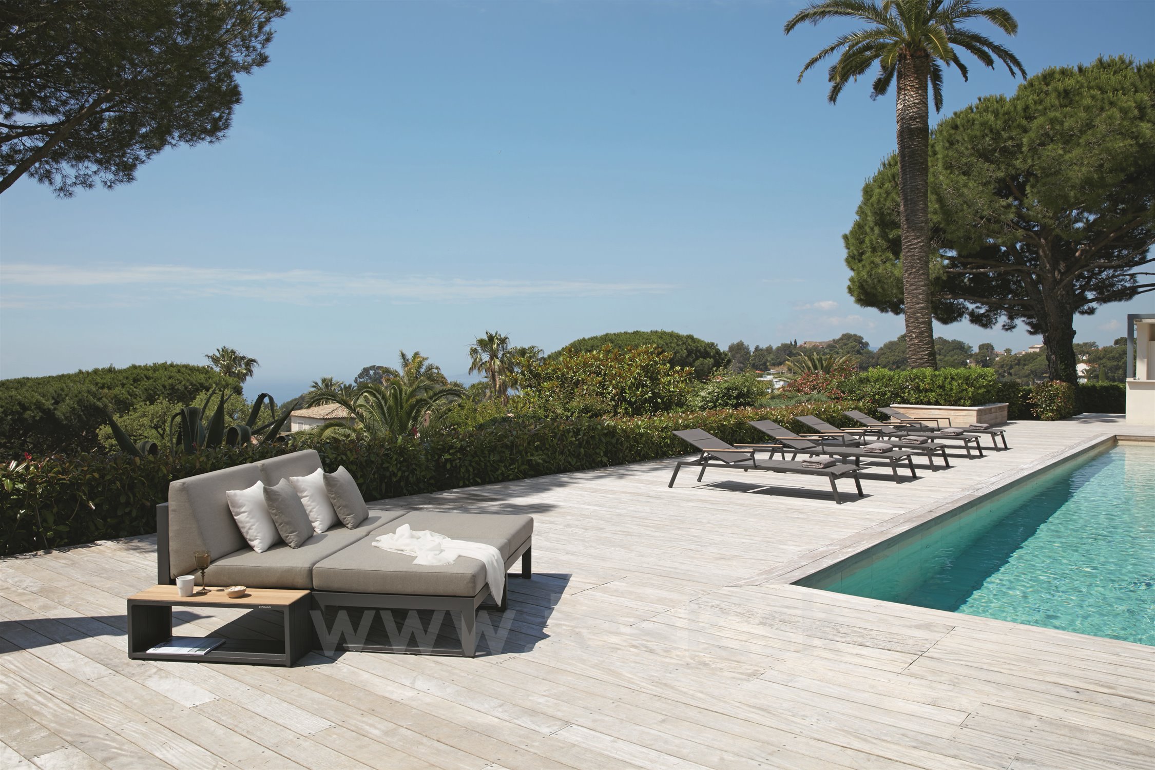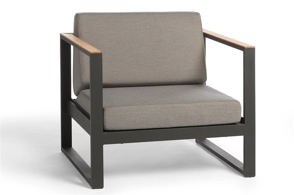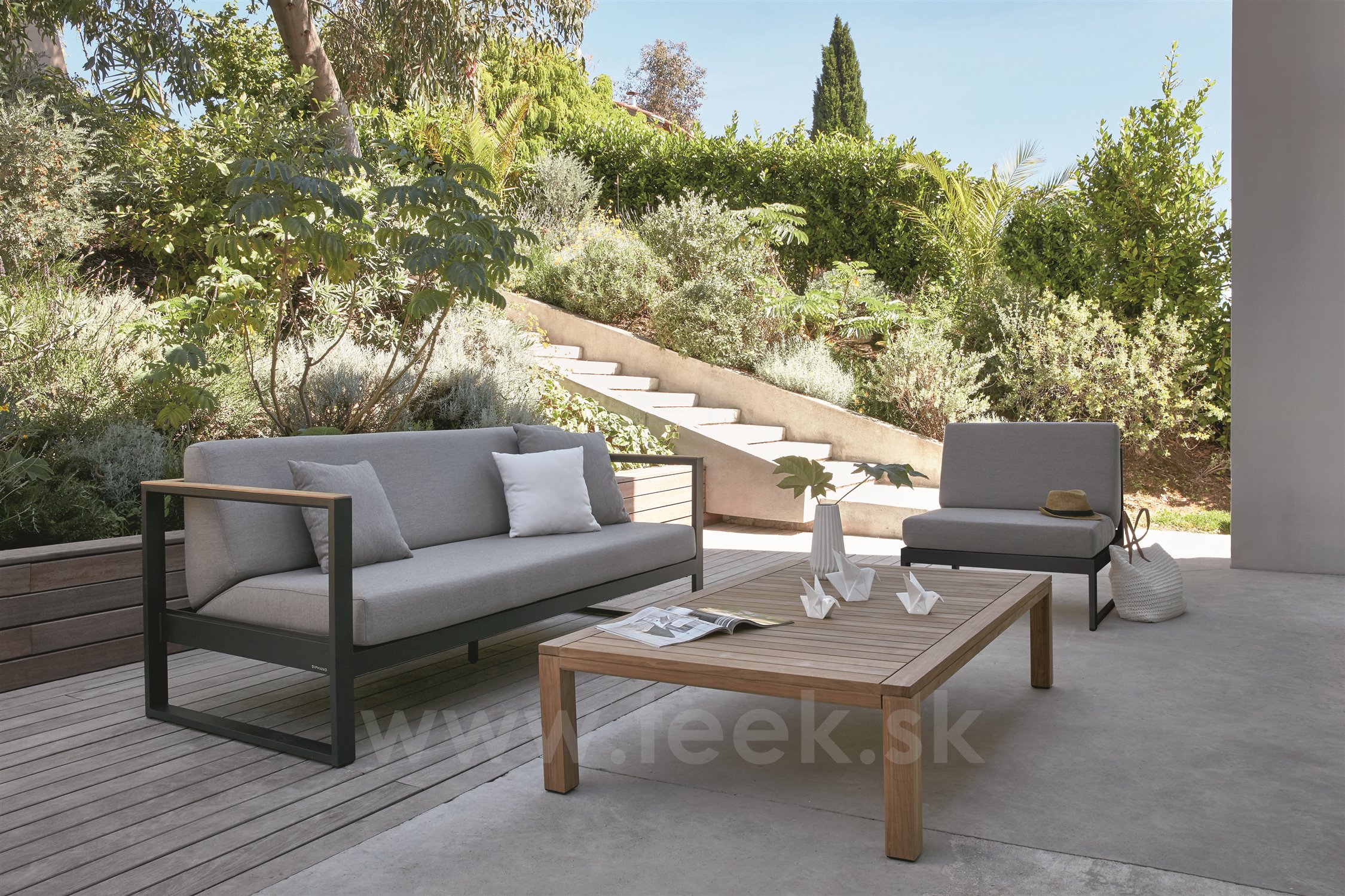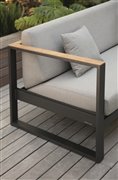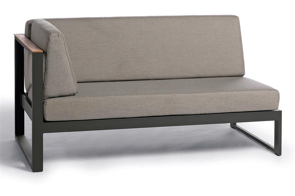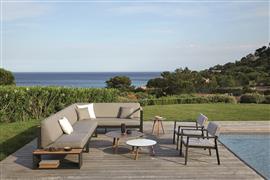 Modulárna záhradná súprava s rámami z lakovaného hliníka s teakovými detailmi na podrúčkach a vonkajším čalúnením obsahuje rôzne diely, ktoré vám umožnia vytvoriť si súpravu na sedenie podľa vašich potrieb a priestoru.