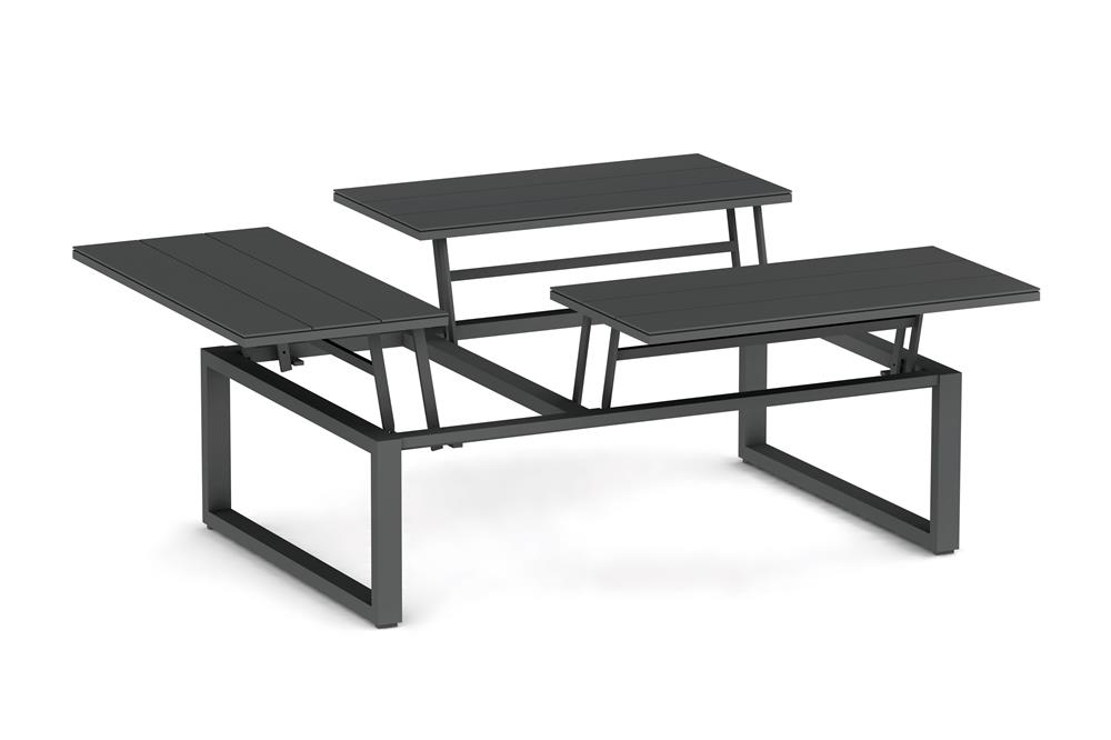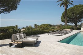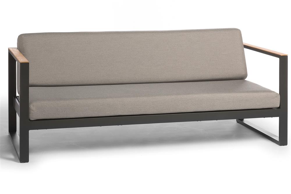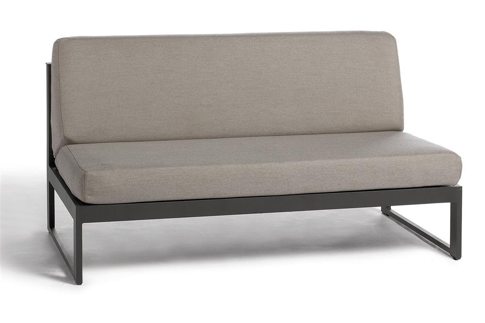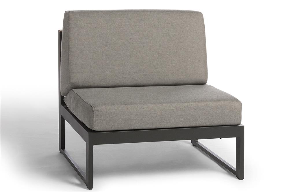 Modulárna záhradná súprava s rámami z lakovaného hliníka s teakovými detailmi na podrúčkach a vonkajším čalúnením obsahuje rôzne diely, ktoré vám umožnia vytvoriť si súpravu na sedenie podľa vašich potrieb a priestoru.