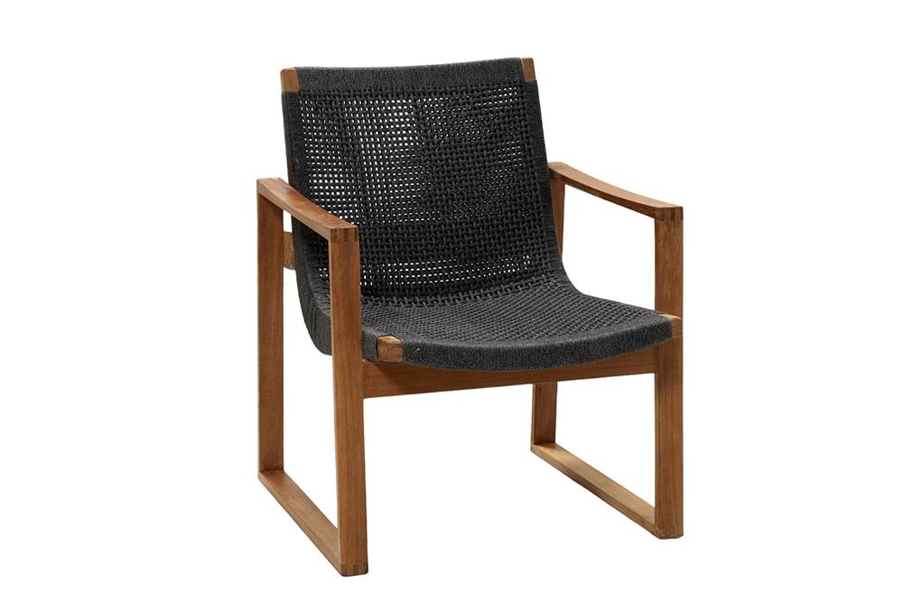 Lounge kreslo kombinujúce teak a lanový výplet.