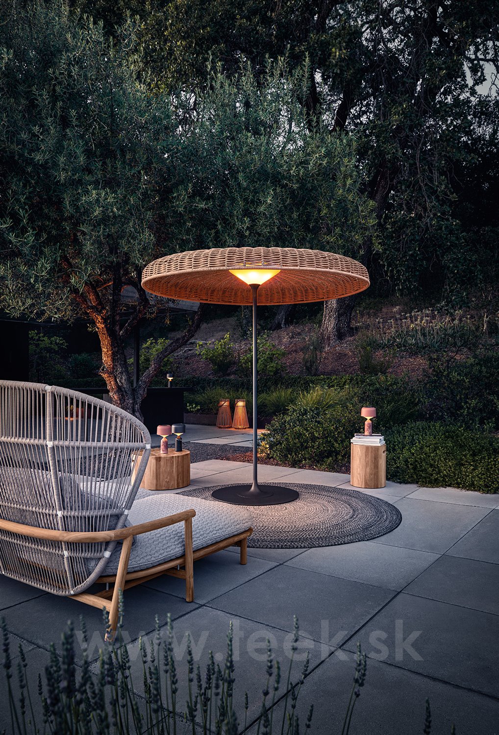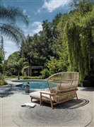 Frame: teak wood and lacquered aluminium braided with wire mesh. Seat cushions: outdoor fabric - colour according to swatch, fillings in outdoor quality.