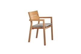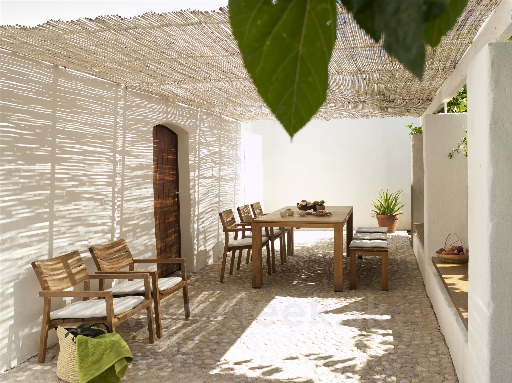 The Kos Teak dining, stackable outdoor armchair by Tribu, crafted from teak wood.