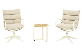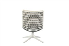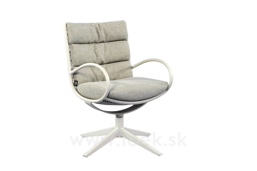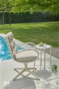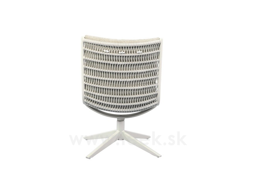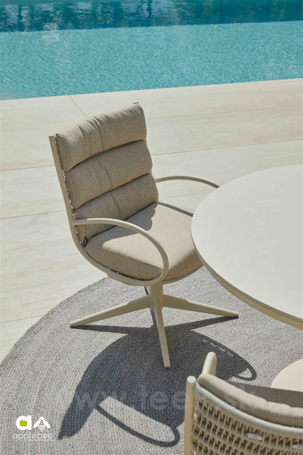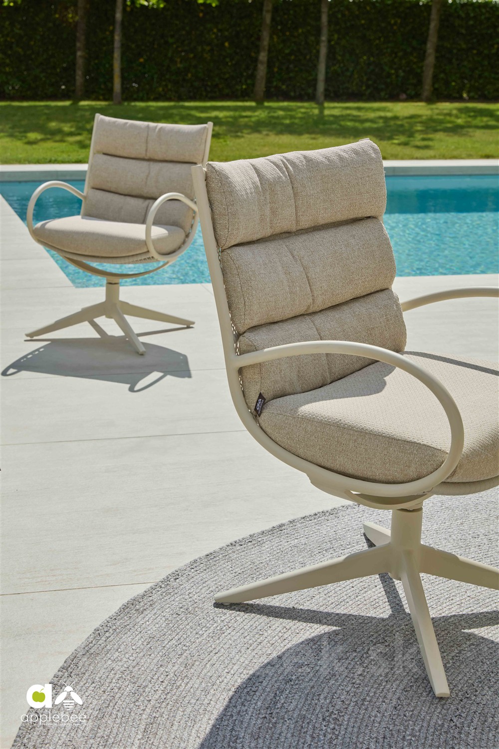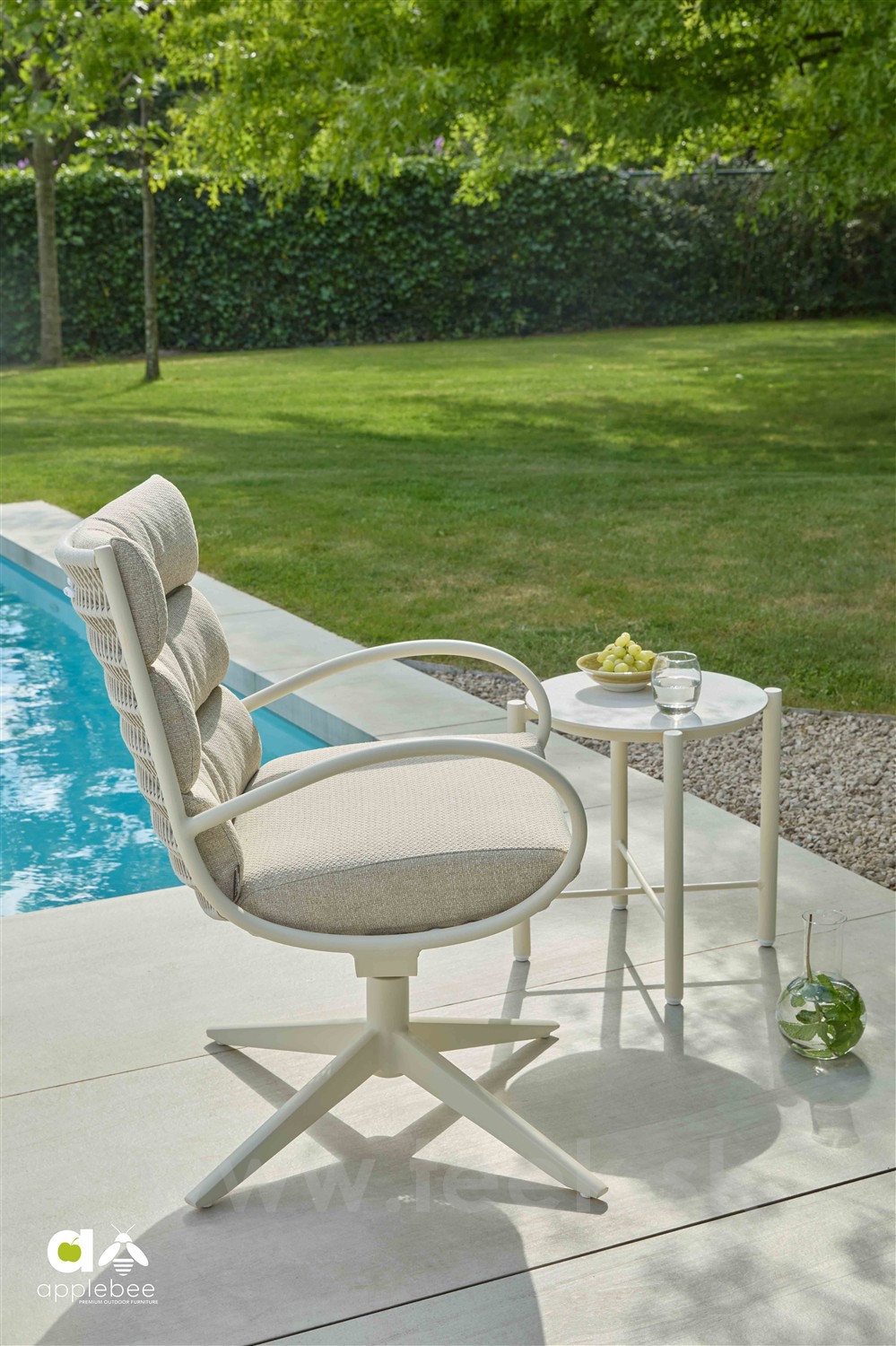 Camp Bay Swivel Armchair by Apple Bee, featuring an Oyster lacquered steel frame, Cream White rope weave, and cushions upholstered in Cotton Flower outdoor fabric