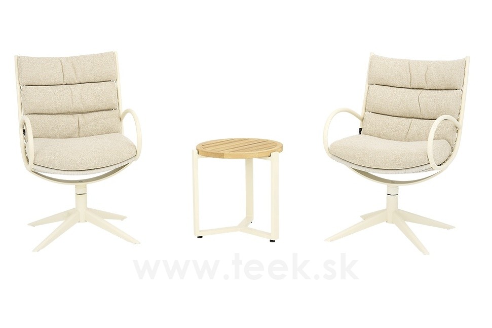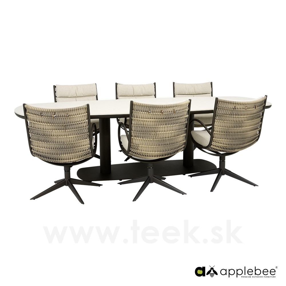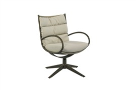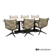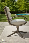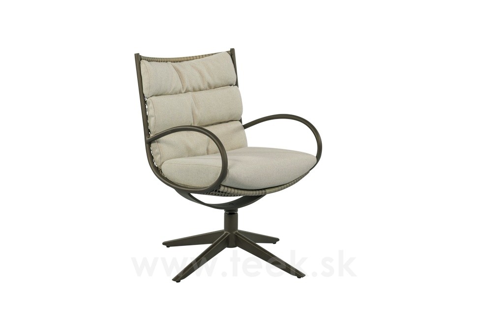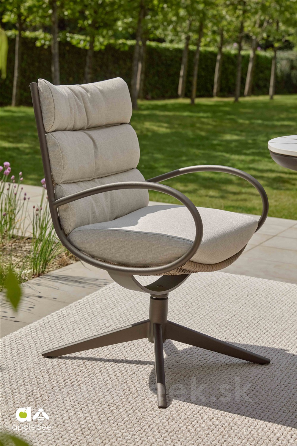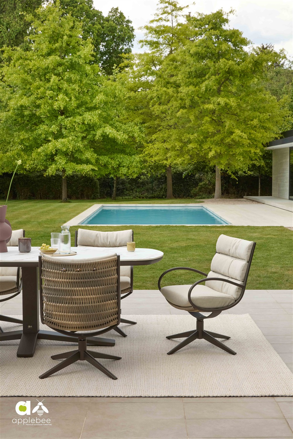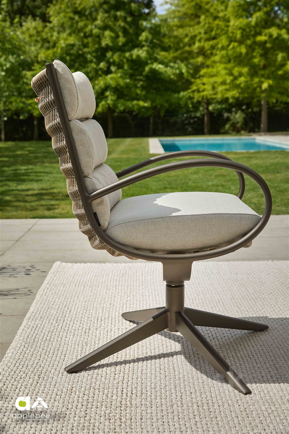 Camp Bay Swivel Armchair by Apple Bee, featuring a bronze lacquered steel frame, Teak Grey cord weaving, and seat cushions upholstered in Natur-CN outdoor fabric.