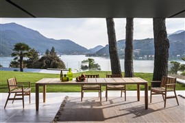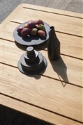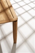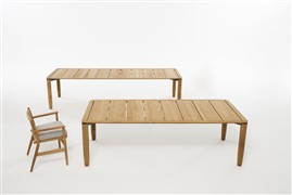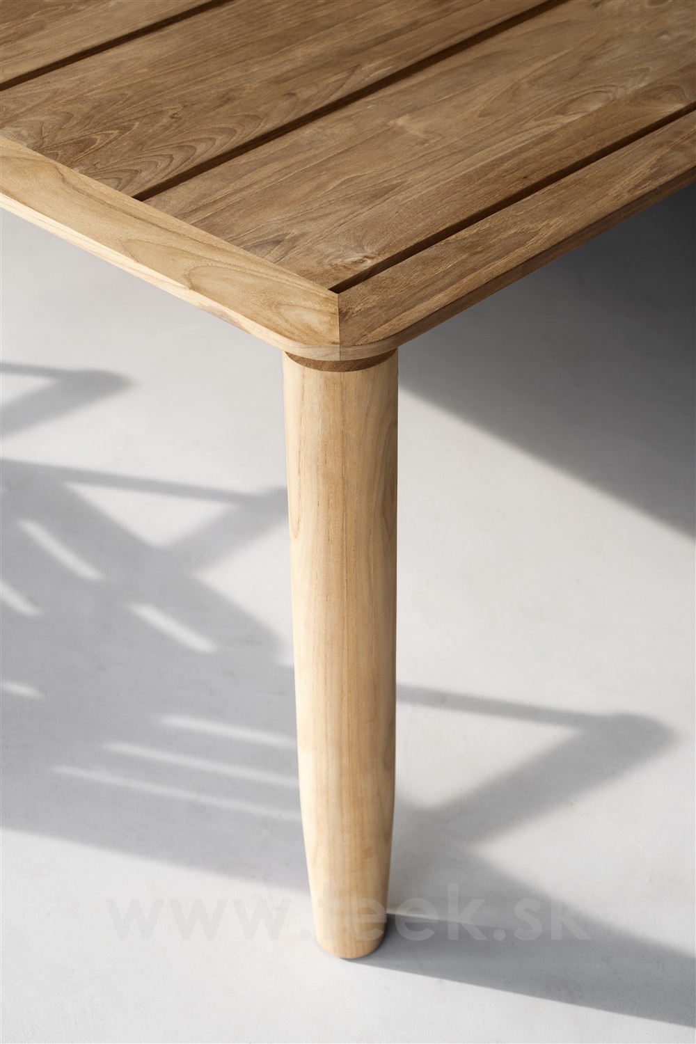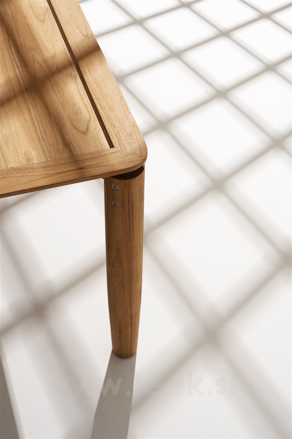 Stôl je teakový s detailmi z nehrdzavejúcej ocele.