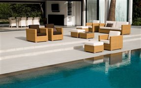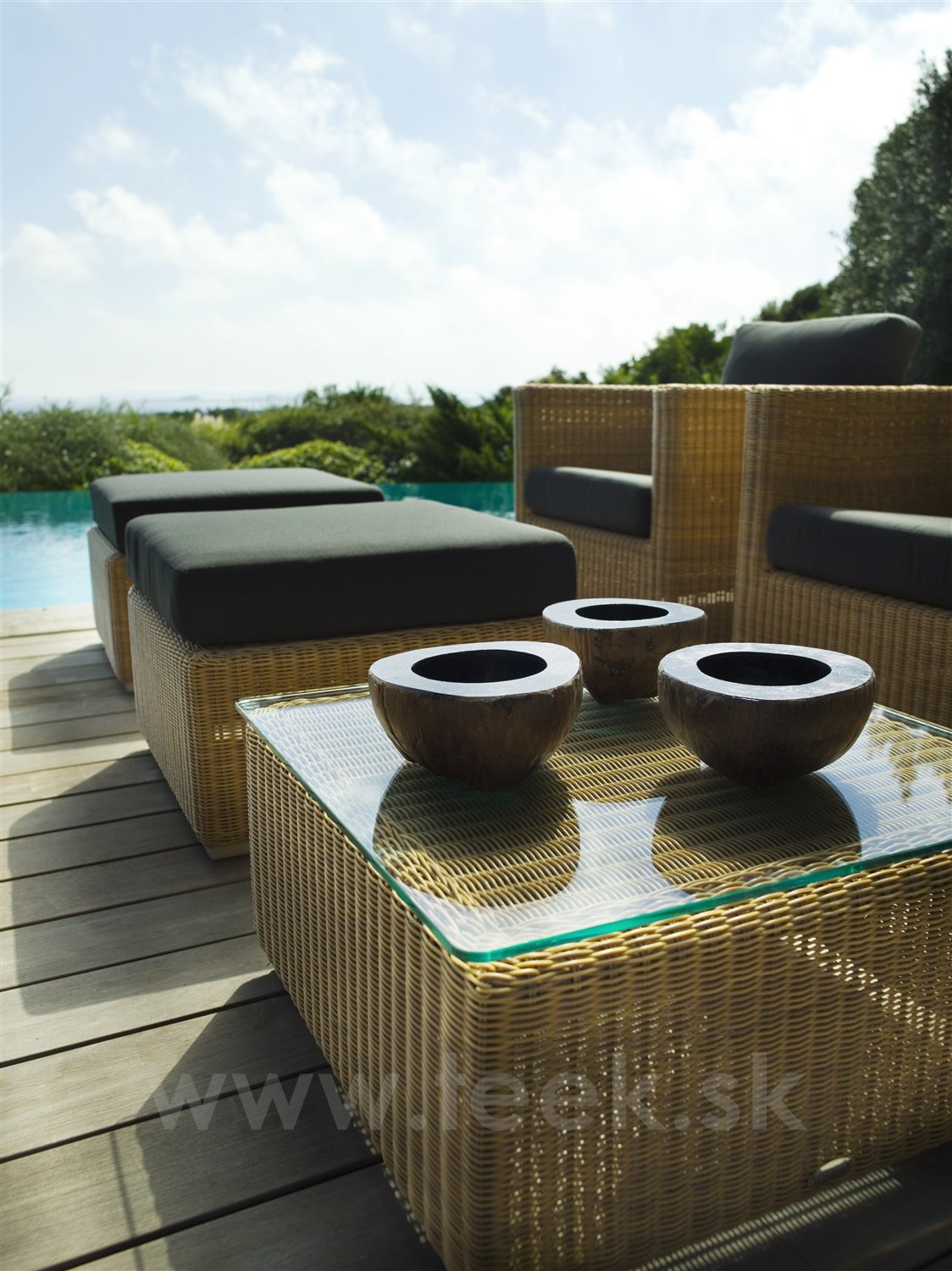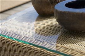 The table/ottoman frame is woven with synthetic rattan. The top can be covered with a clear glass plate or ordered with a seat cushion.