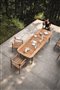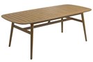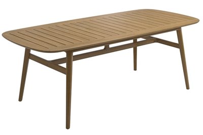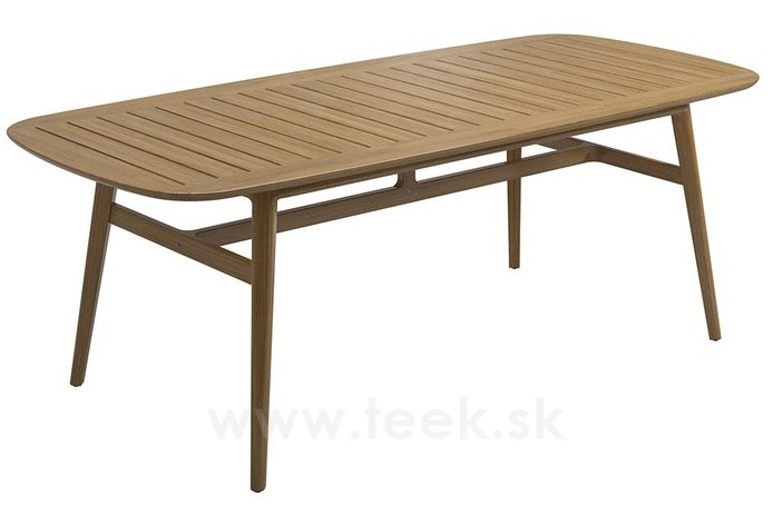 Designové celoteakové venkovní jídelní stoly s oblými hranami.