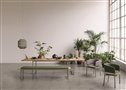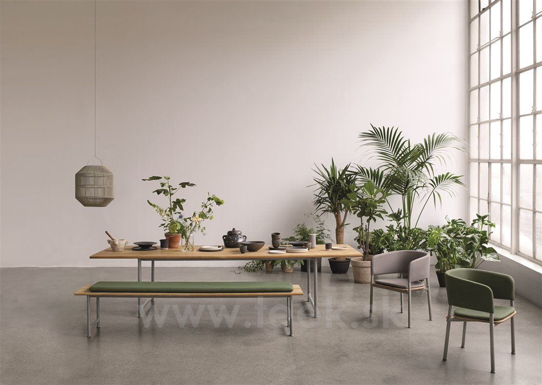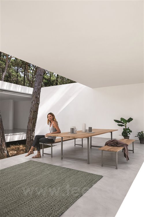 Atmosphere collection of designer garden furniture by Gloster. The collection combines painted aluminium, solid teak and outdoor cushions. The collection includes garden dining benches and tables. All are designed for year-round use.