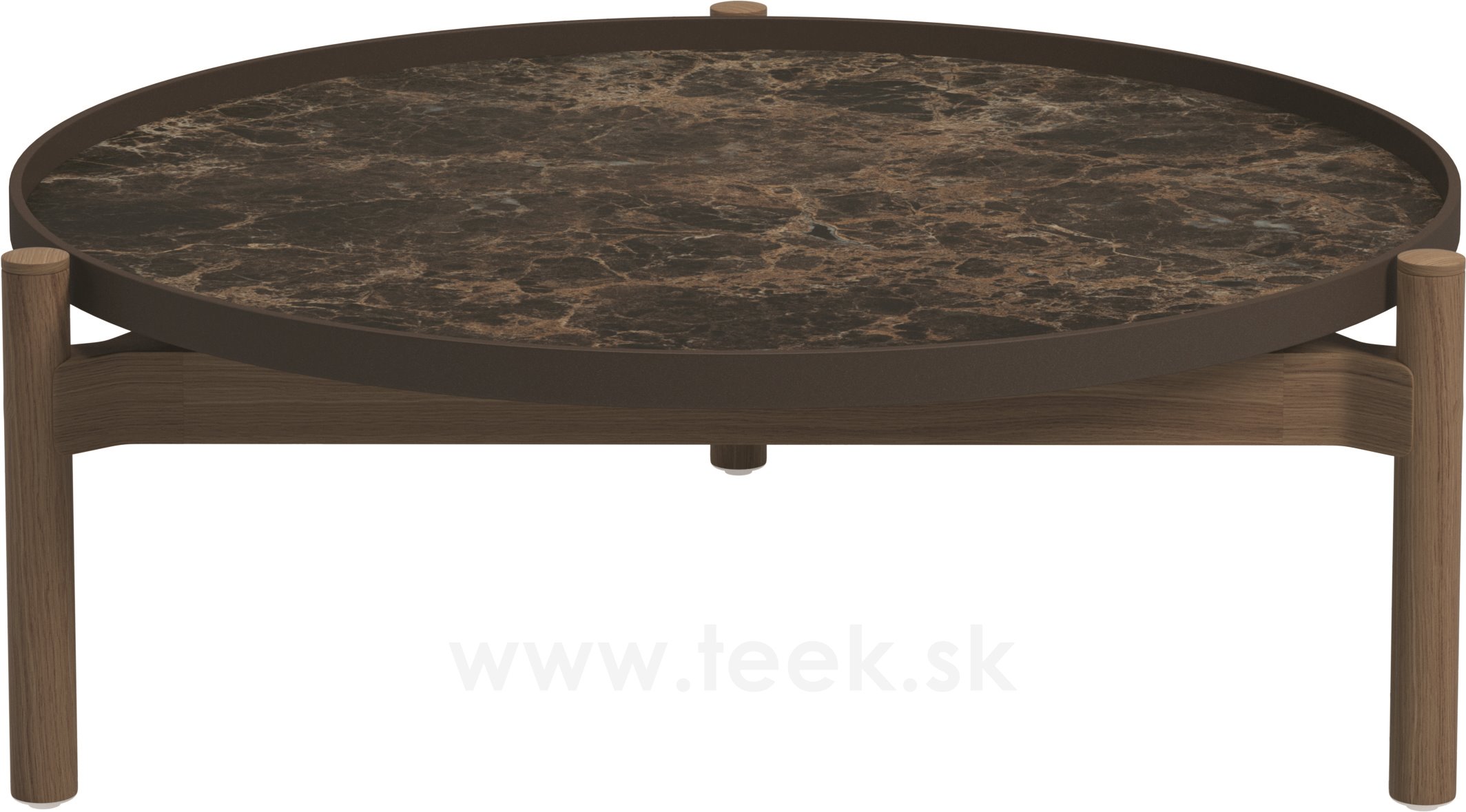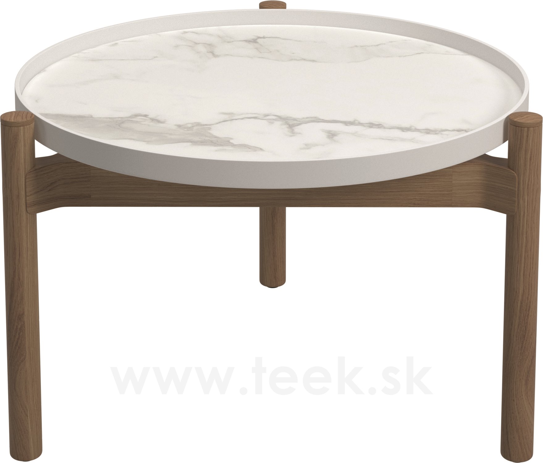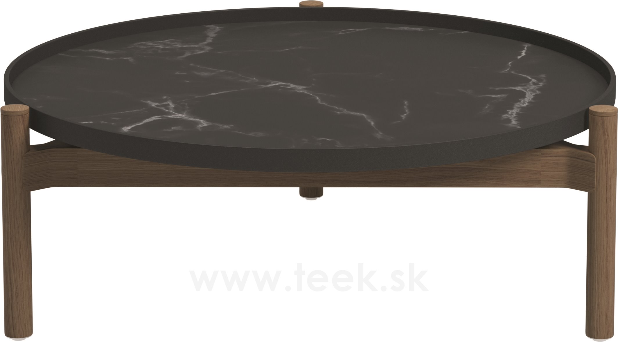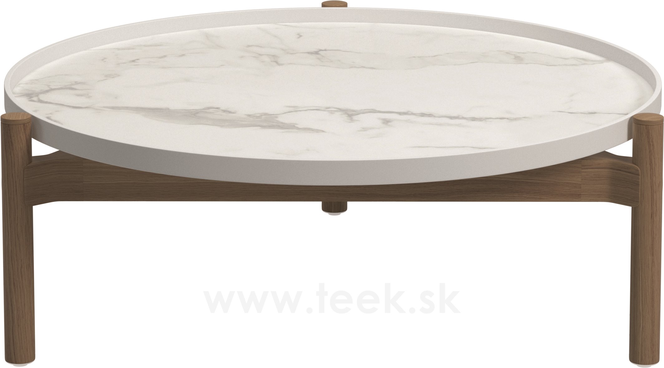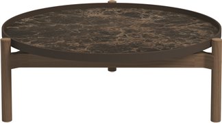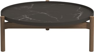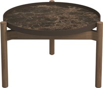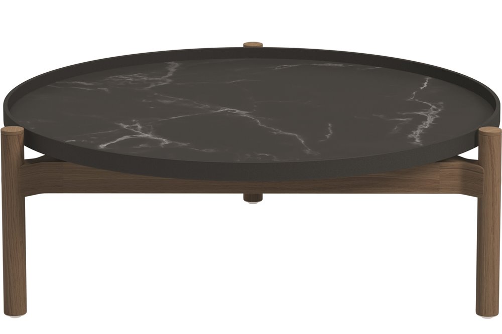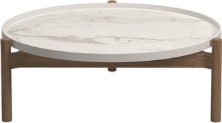 Odkládací a konferenční stolky s keramickou deskou a teakovým rámem.