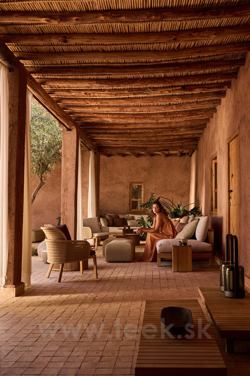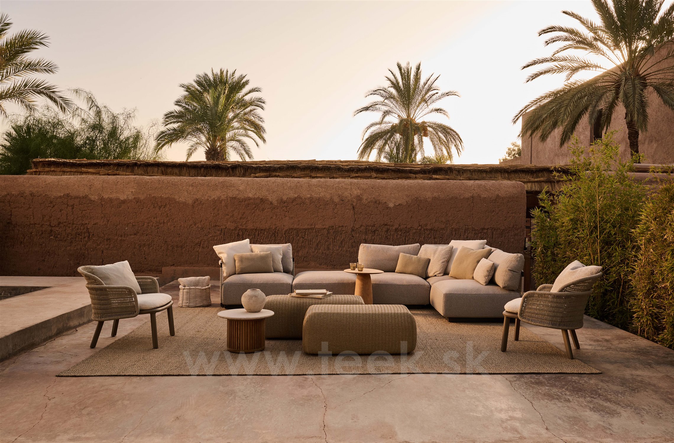 The ottoman is made with a rope weave and is suitable for outdoor use.