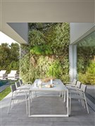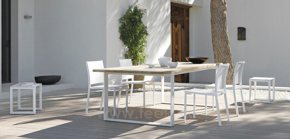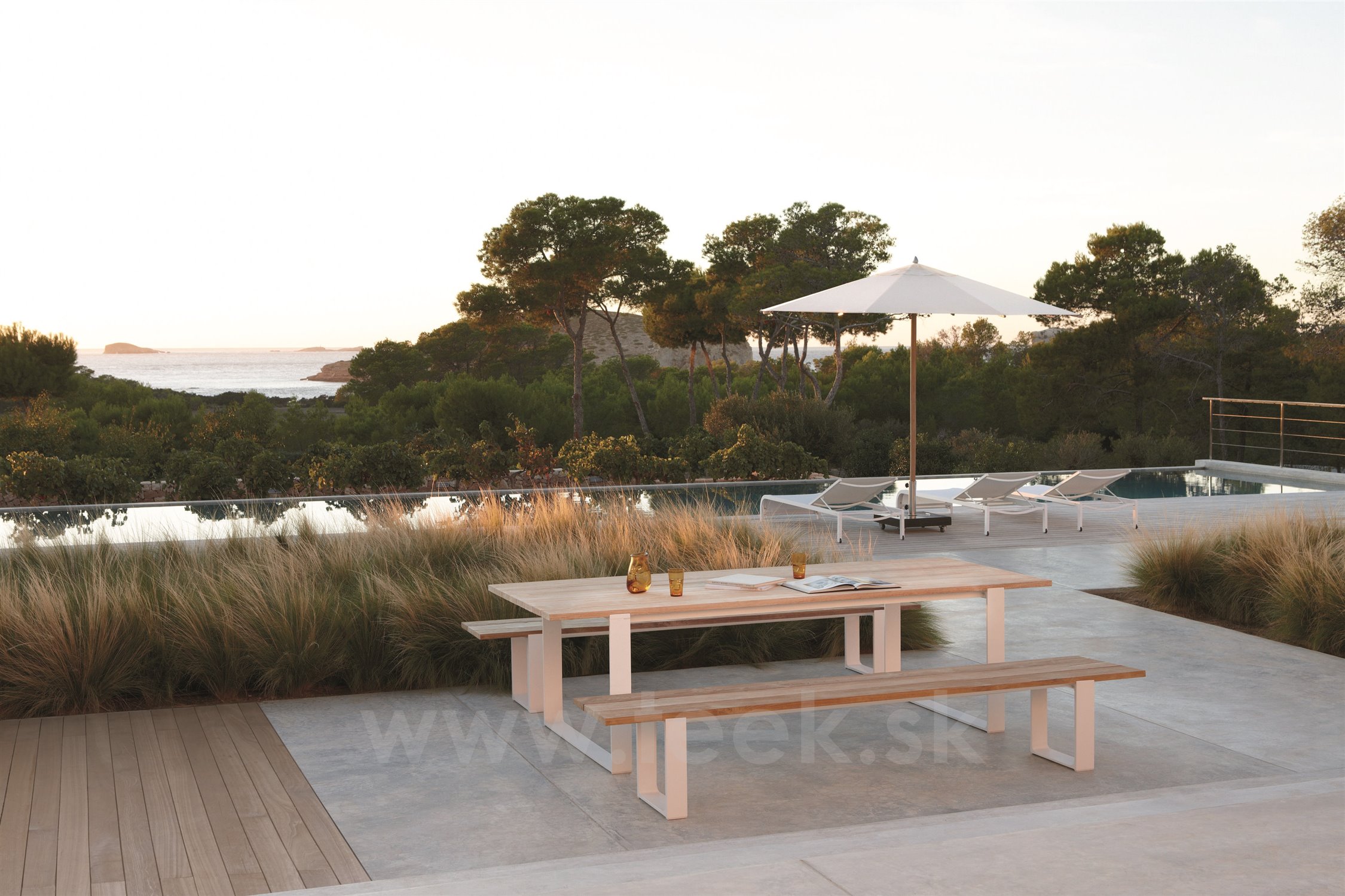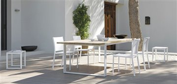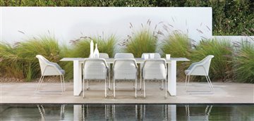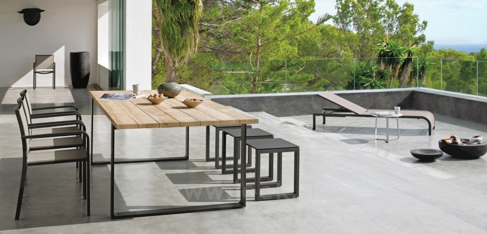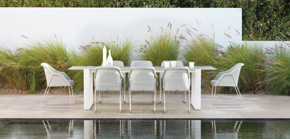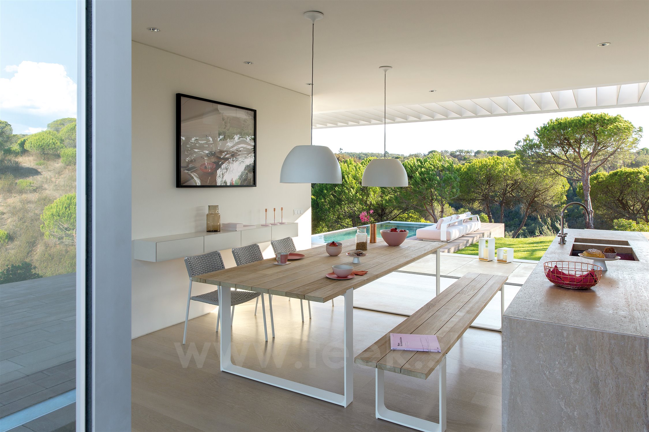 Prato collection by Manutti. The collection has a painted steel frame and different types of tops in several colours. The collection includes dining tables, bench and coffee tables.