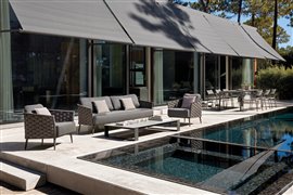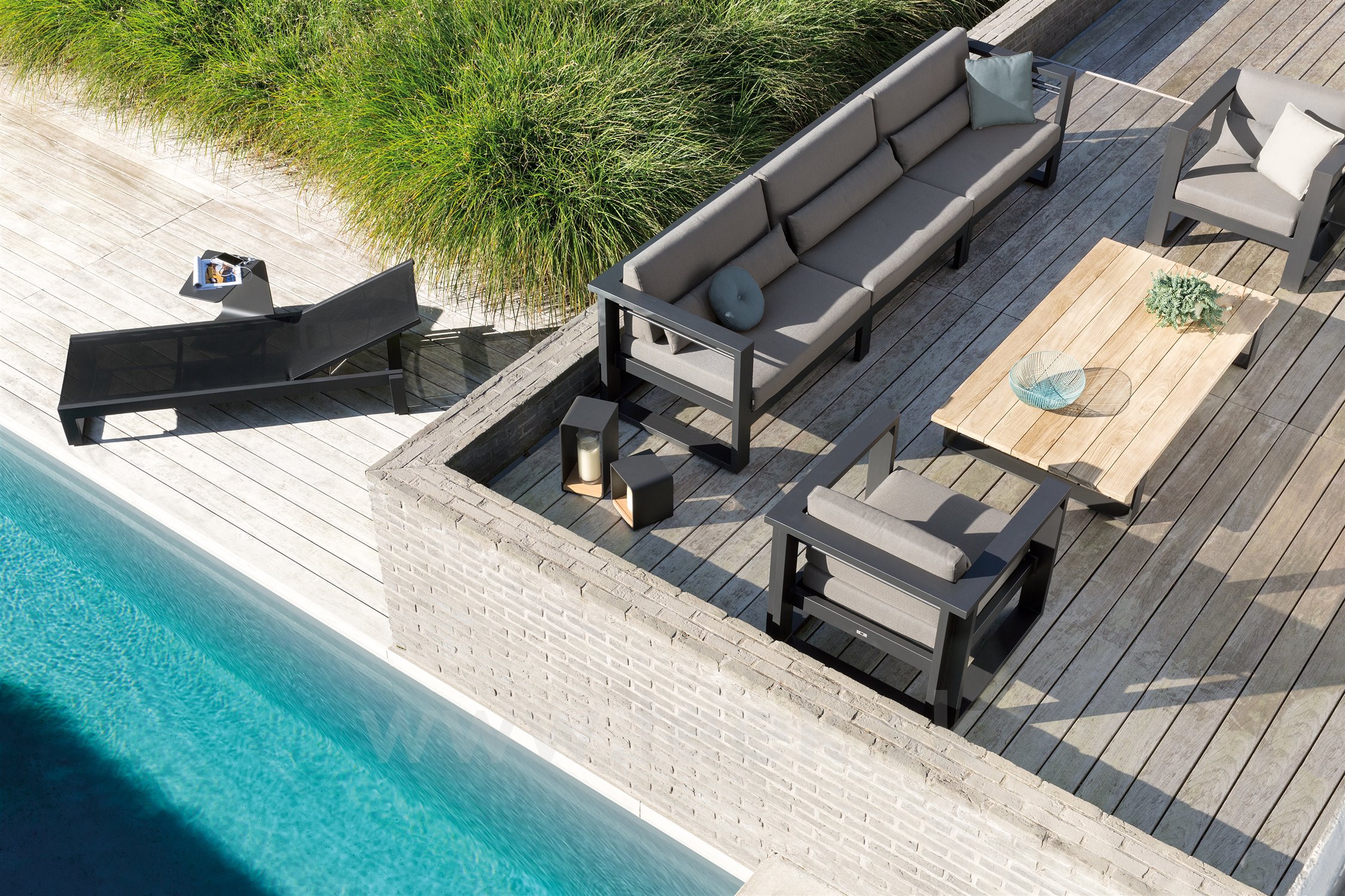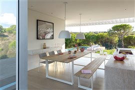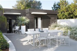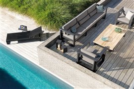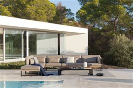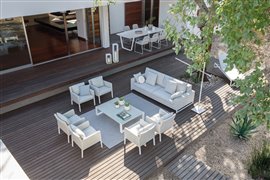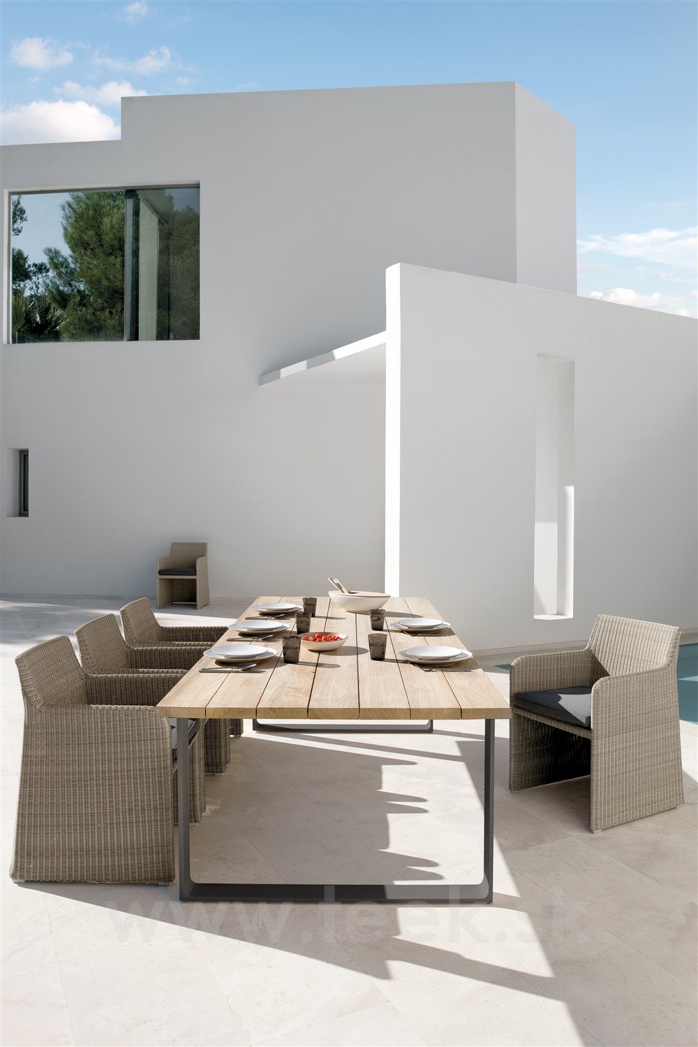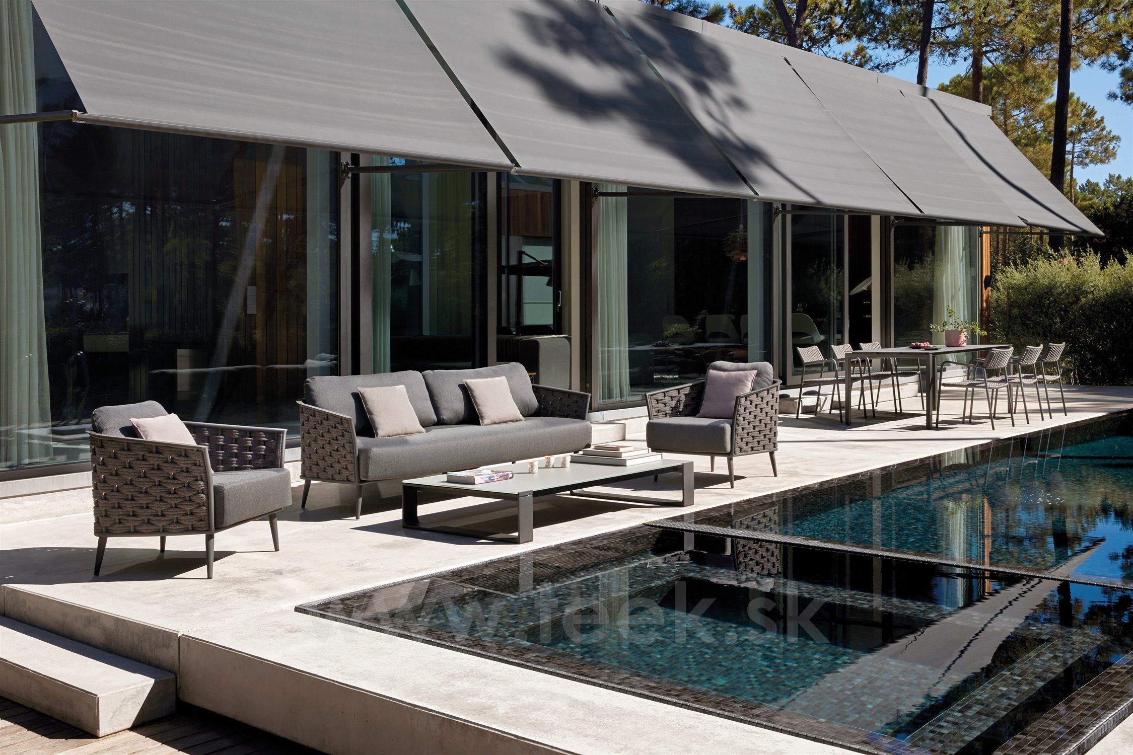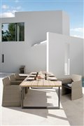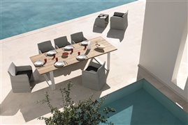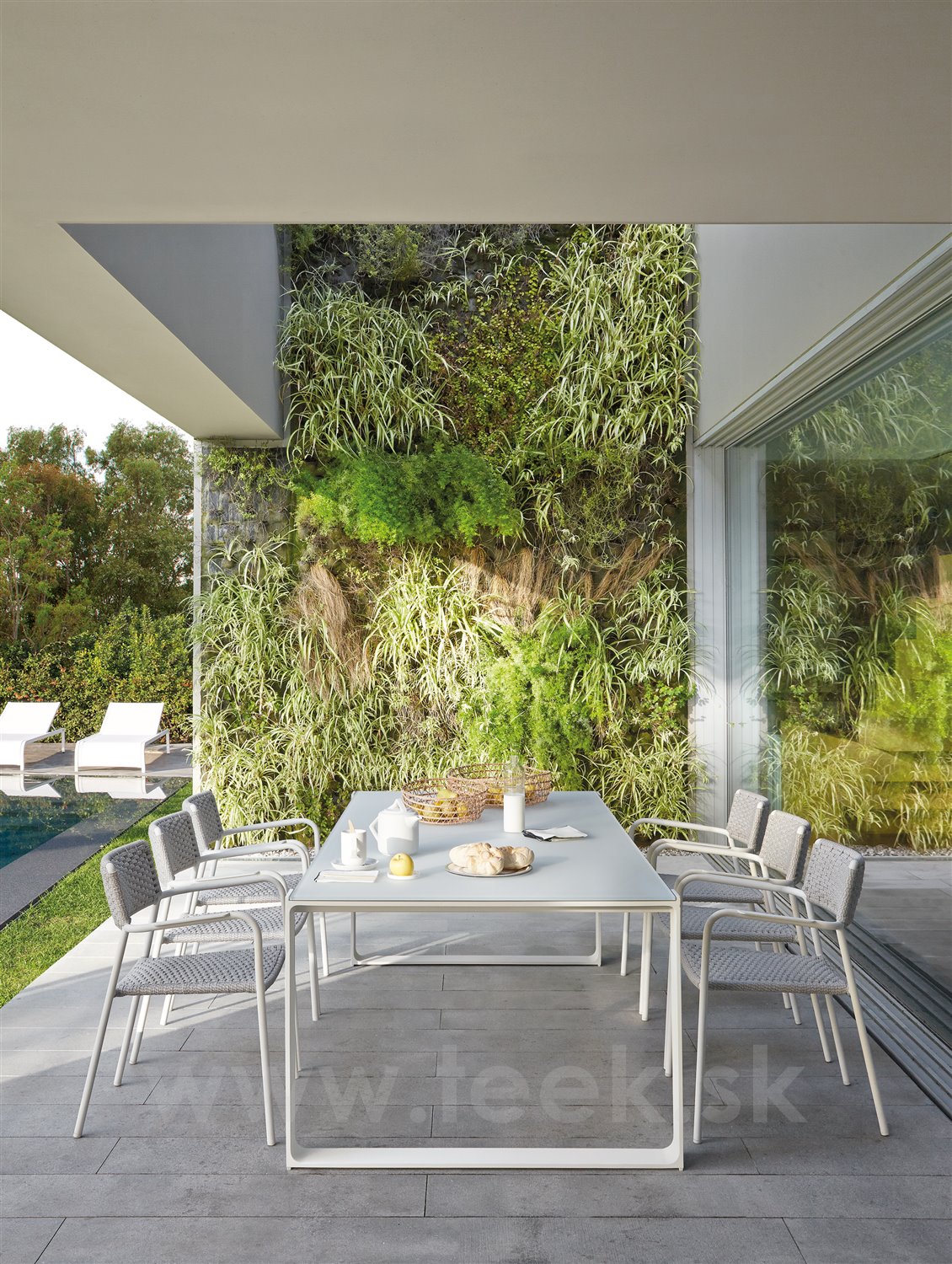 Prato collection by Manutti. The collection has a painted steel frame and different types of tops in several colours. The collection includes dining tables, bench and coffee tables.