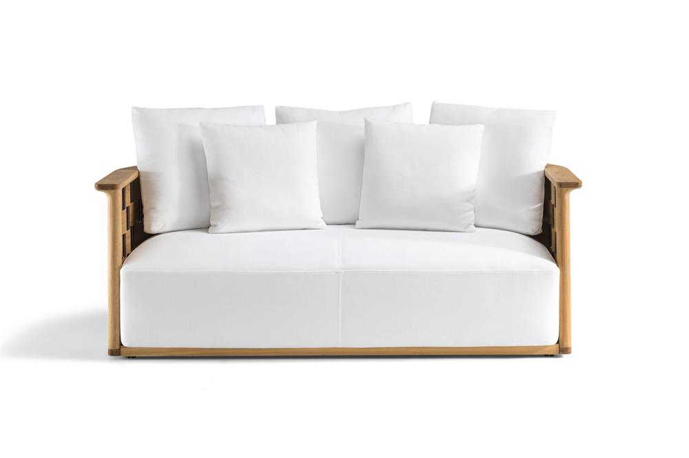 Palinfrasca Sofa z kolekce Landmark navazuje na design Luca Medy z roku 1994. Masivní teaková konstrukce s výrazným tkaným vzorem a organickými liniemi spojuje tradici s moderním pojetím.