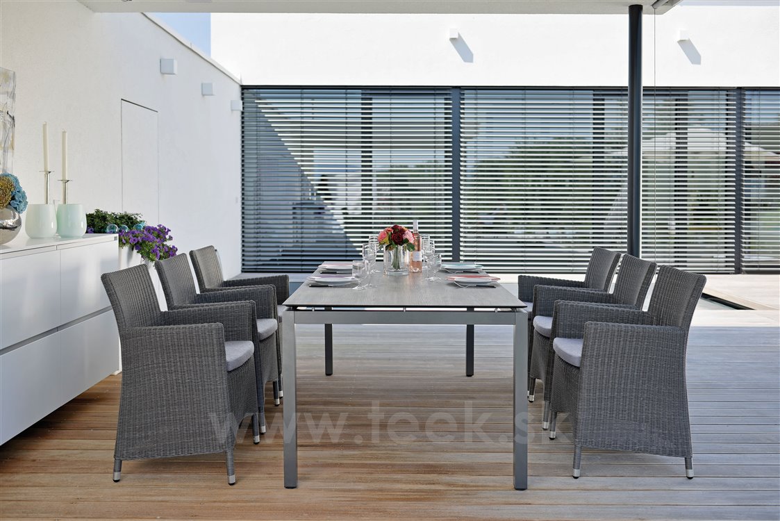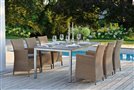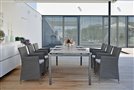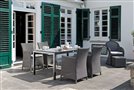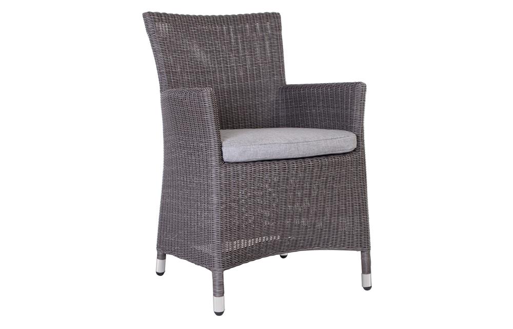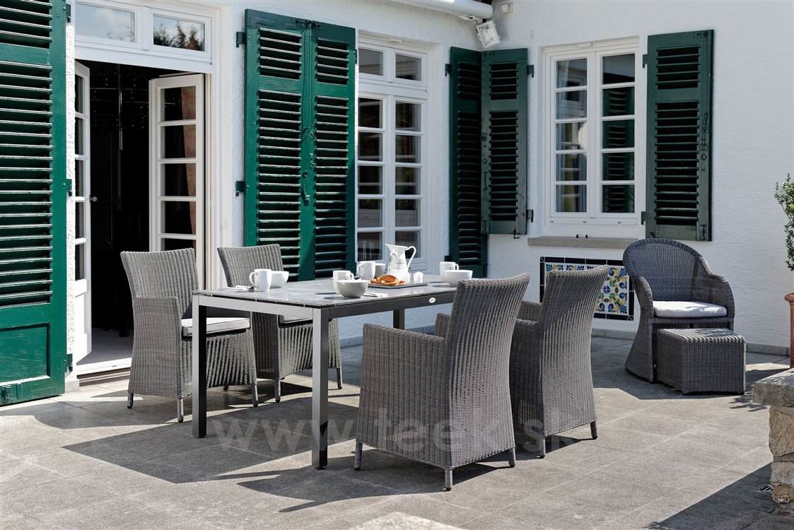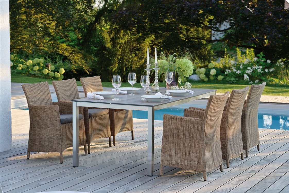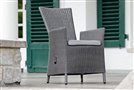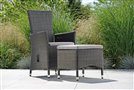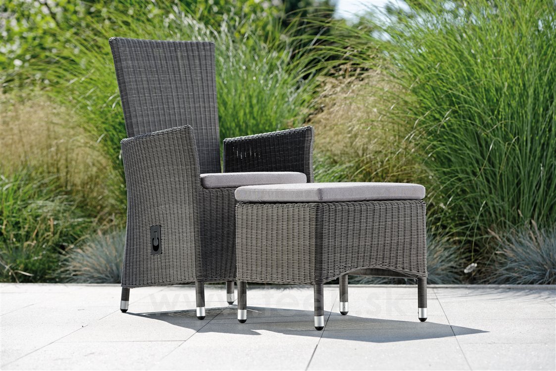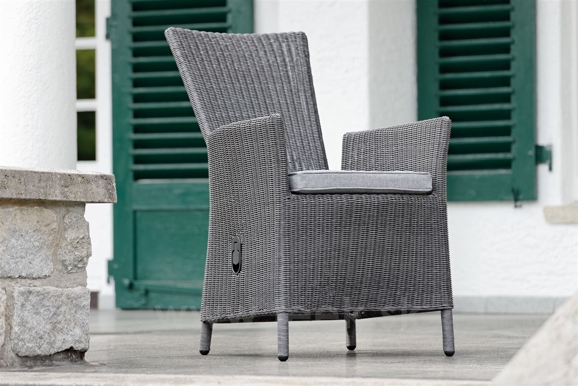 Garden dining chair made of artificial rattan available as fixed or reclining with high backrest, available in several colours, with seat made of high-quality UV-stable outdoor fabric (regular foam filling). A footrest can also be purchased.