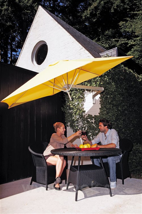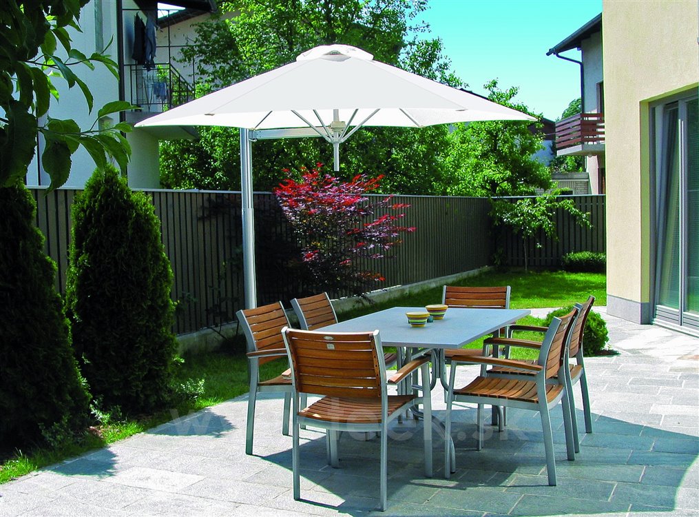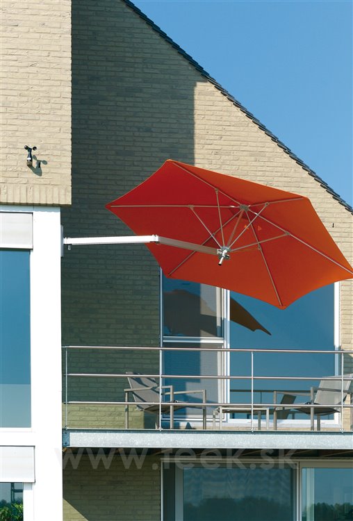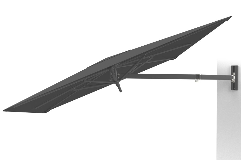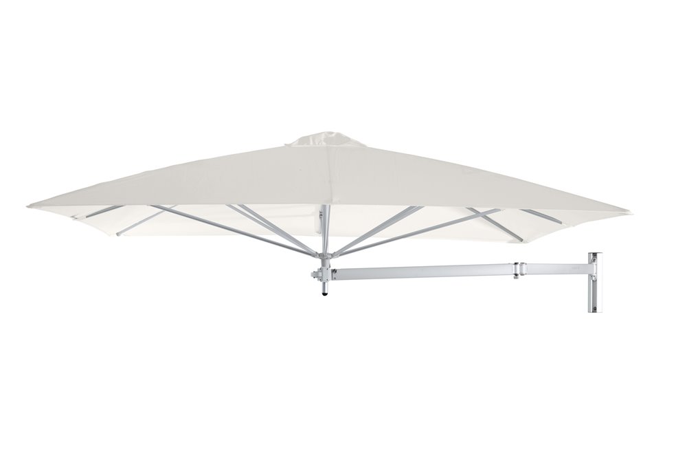 The Paraflex parasol was designed by Peter Leleu in 1999, the unique design of the adjustable arm allows flexible adjustment of the parasol. The arm can be mounted on the wall to save space for a large umbrella stand and pole, as an option the Paraflex can be placed on a freestanding pole. If a pole is used, up to 5 Paraflex parasols can be placed on one pole depending on the profile of the pole used. The parasol is available in the following dimensions - round 270 and 300 cm, square 190x190 and 230x230 cm. The cover can be selected from a colour swatch in two qualities of cover fabric.