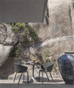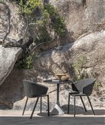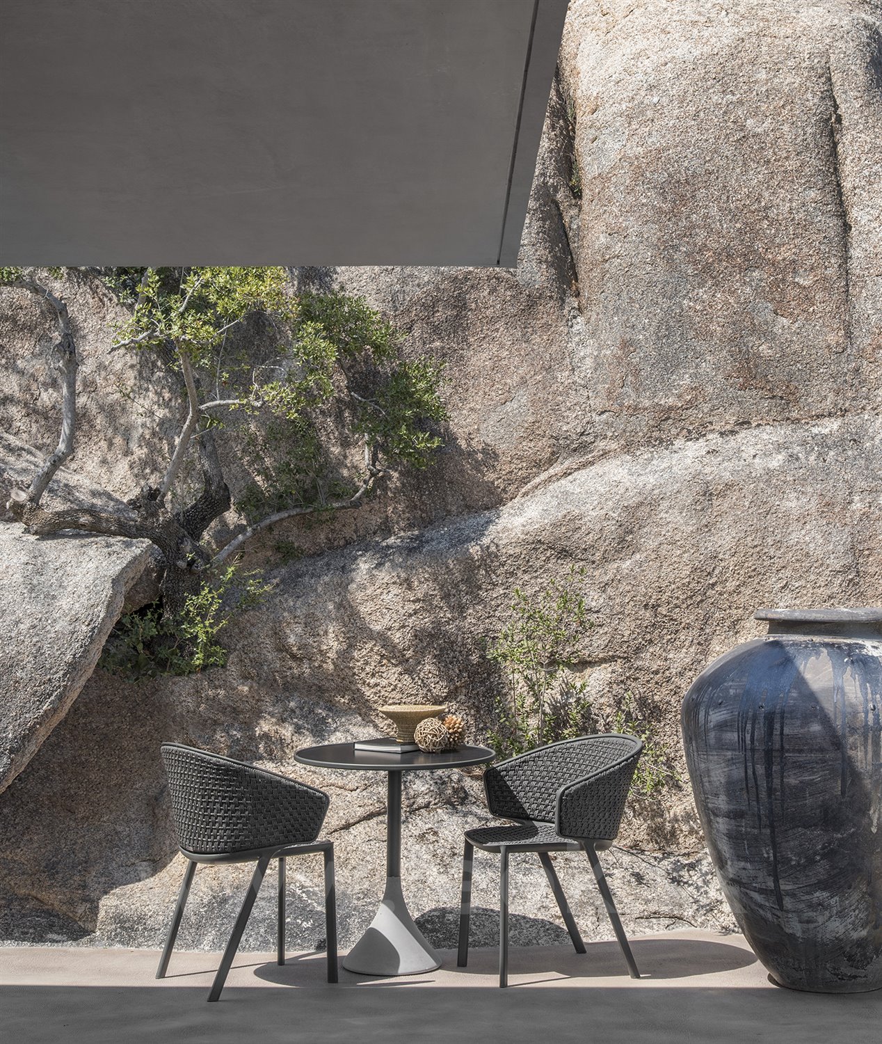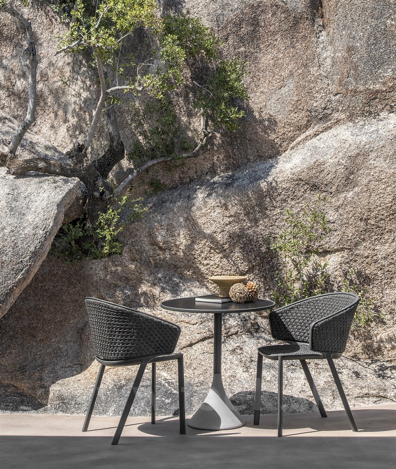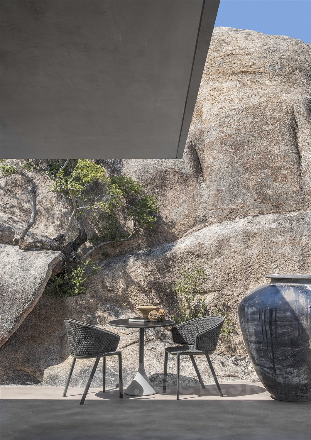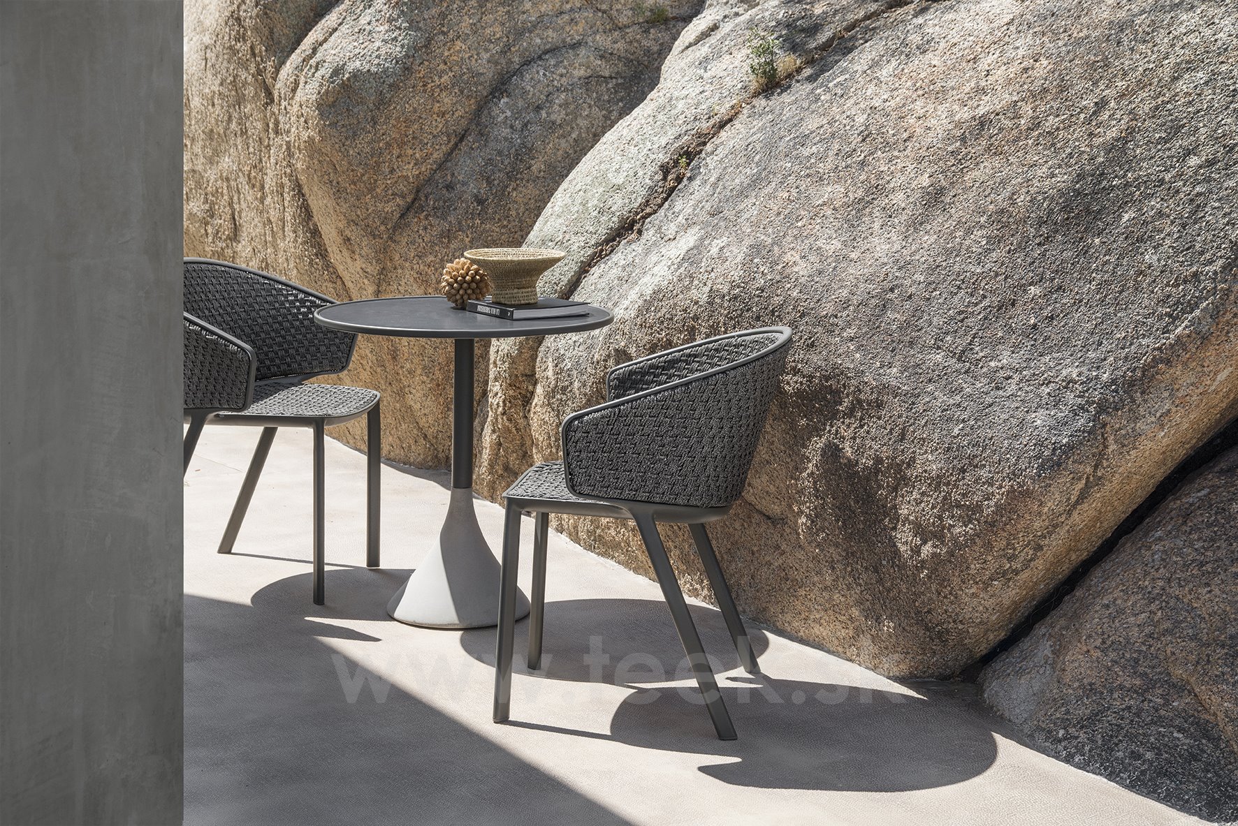 Stoly Concreto s pevnou cementovou základňou majú hliníkovú konštrukciu a teakové alebo laminátové dosky, ktoré sú k dispozícii v okrúhlom alebo štvorcovom vyhotovení.