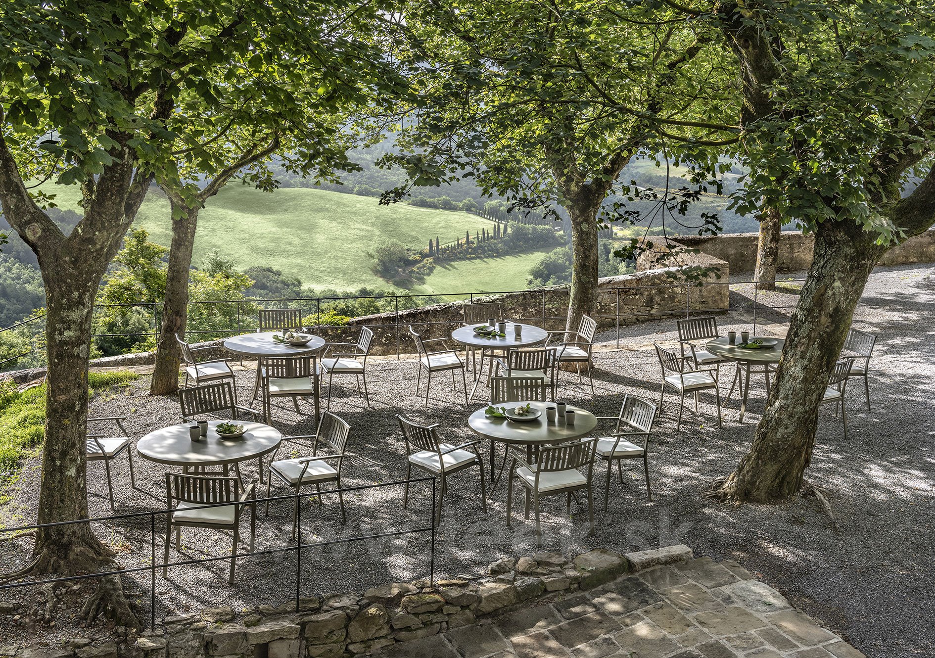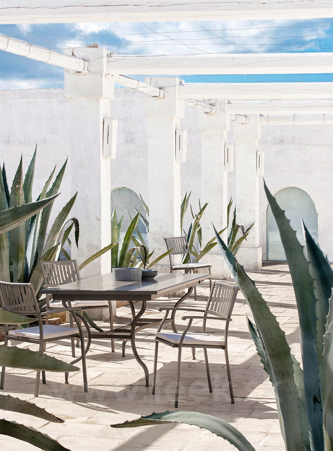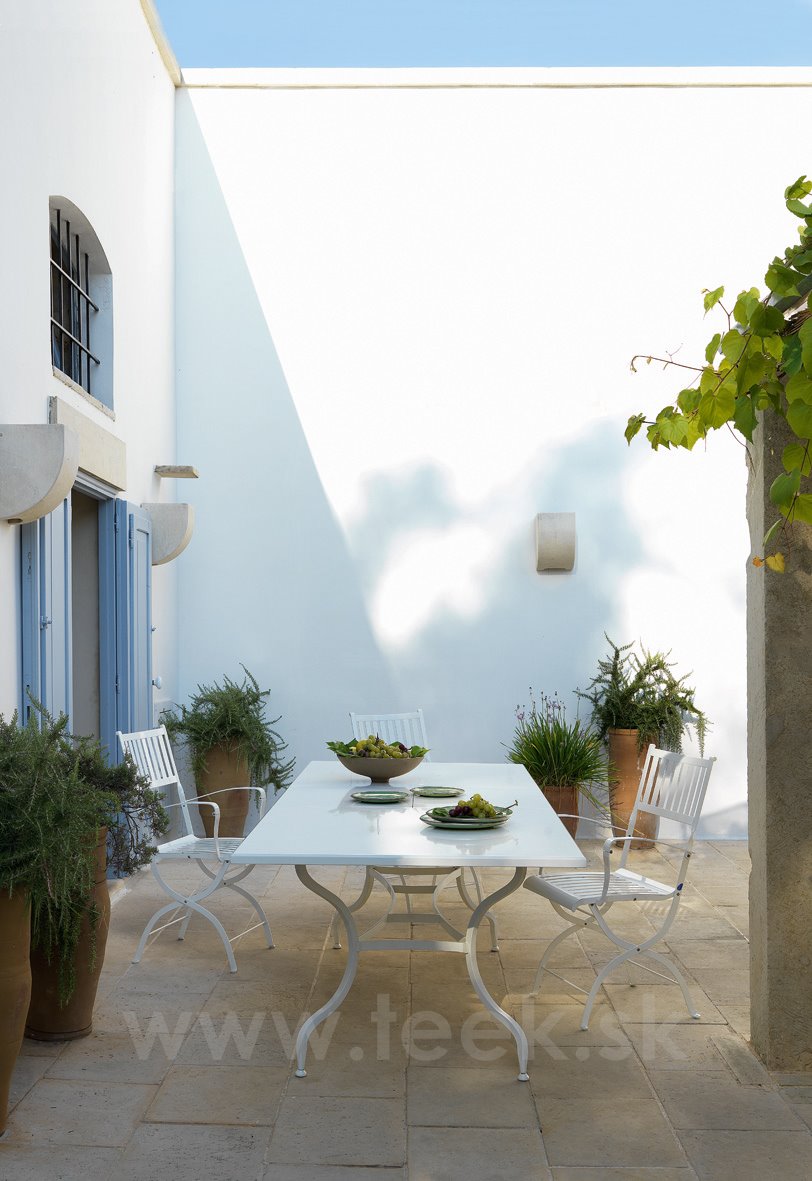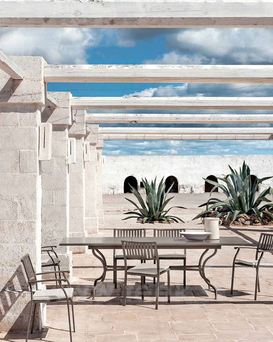 Táto kolekcia oceľového nábytku, inšpirovaná klasickými prvkami, vykazuje nadčasový štýl, ale je pripravená splniť všetky potreby súčasného vonkajšieho prostredia.