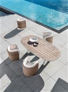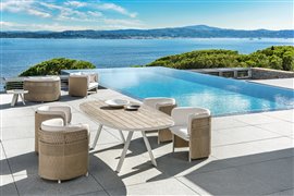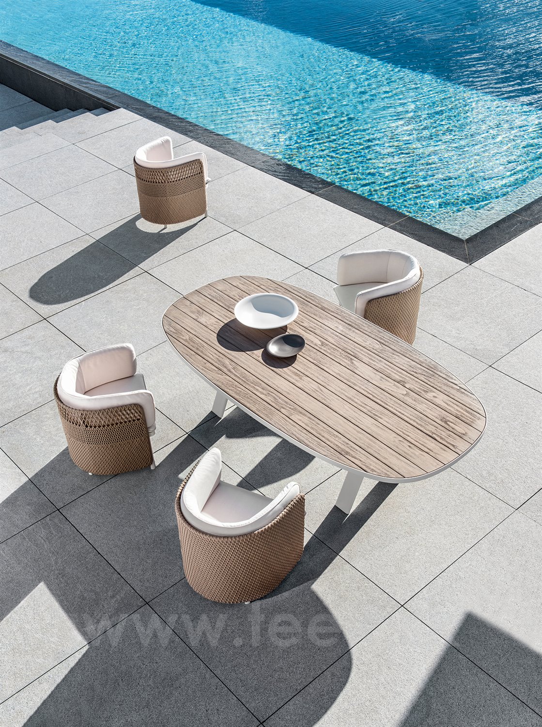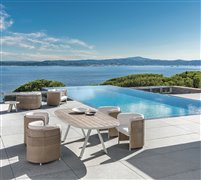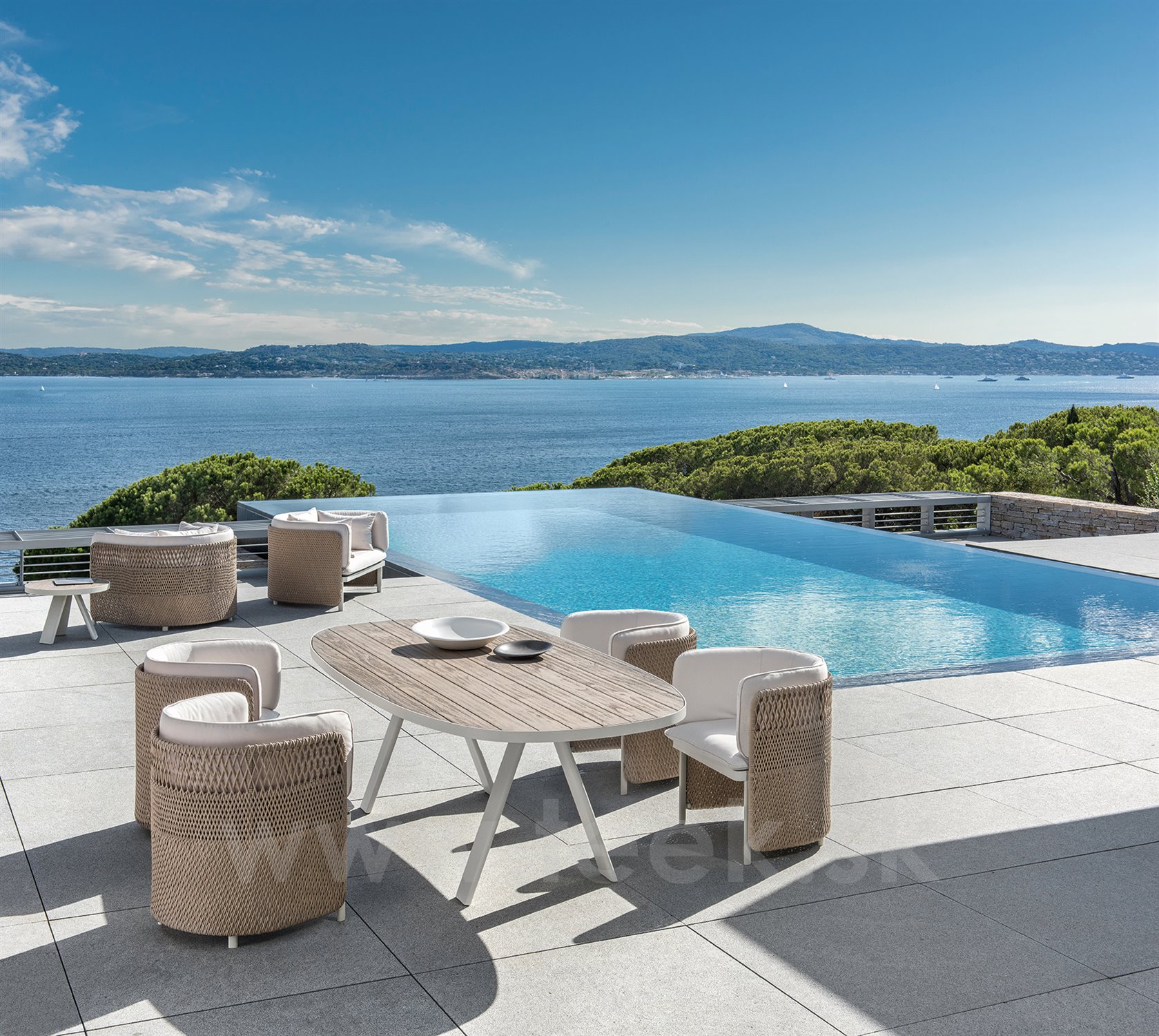 Kolekcia Esedra, inšpirovaná prvkami klasickej architektúry, je súčasnou ikonou exteriéru. Kombinácia hliníka a teakového dreva s umelými vláknami obnovuje remeselný dojem a má teplo typické pre prírodné tkané vlákna, čoho výsledkom sú rafinované a príjemné riešenia, ktoré navodzujú pocit uvoľnenia a pohody.