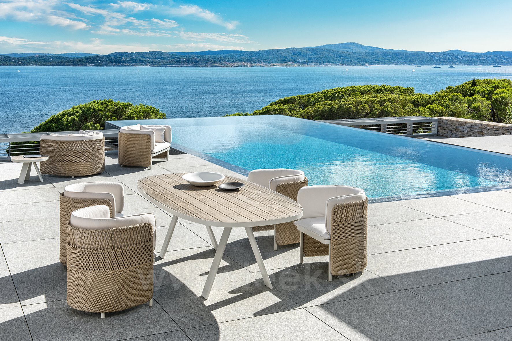 Jedálenské stoličky a stoly z hliníka, ratanu a teakového dreva.