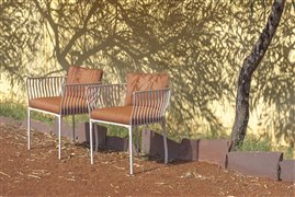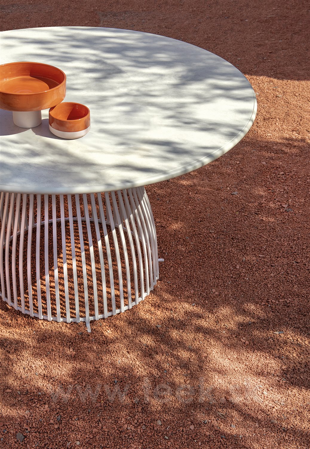 Elegancia mestského nábytku z konca 19. storočia ožíva v projekte, ktorý spája nadčasový šarm a modernú funkčnosť. Hliníkový rám, ktorý vizuálne pripomína starobylé zábradlie, charakterizuje jedálenskú súpravu a obklopuje veľkorysé a oblé tvary sedadiel s pocitom ľahkosti a robustnosti zároveň.