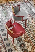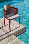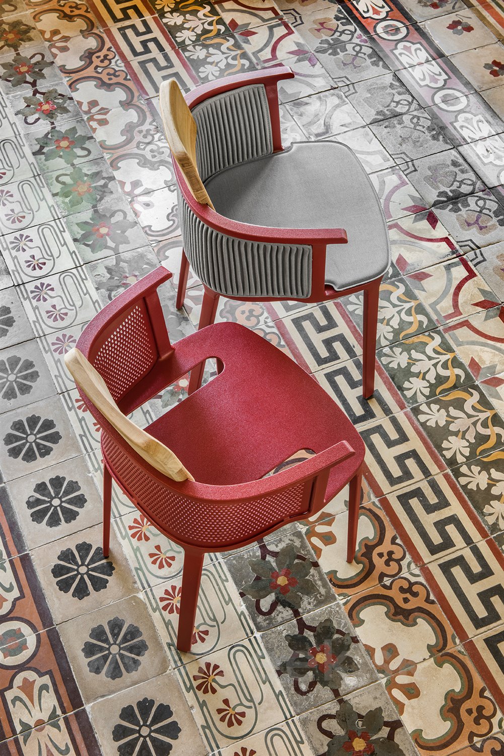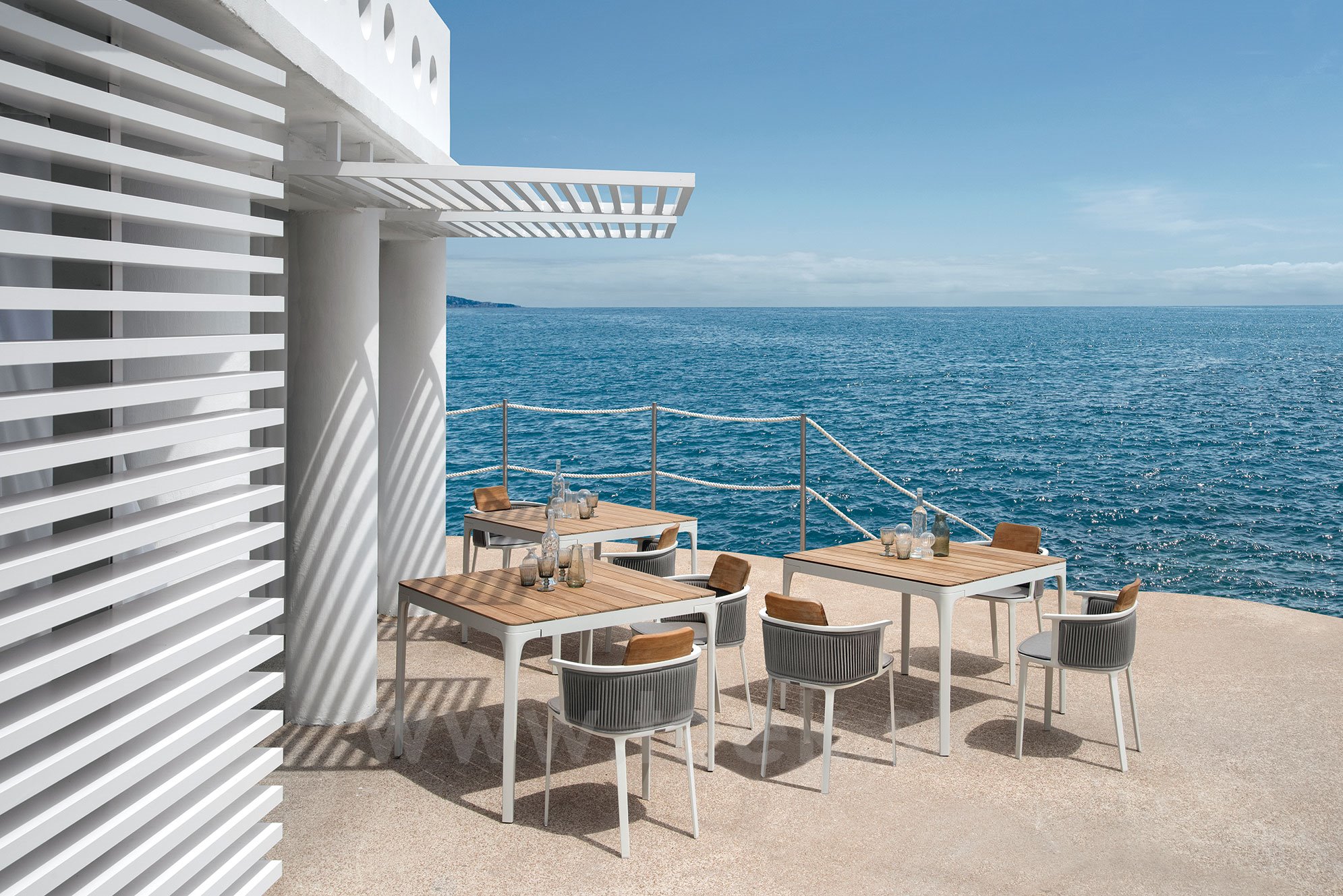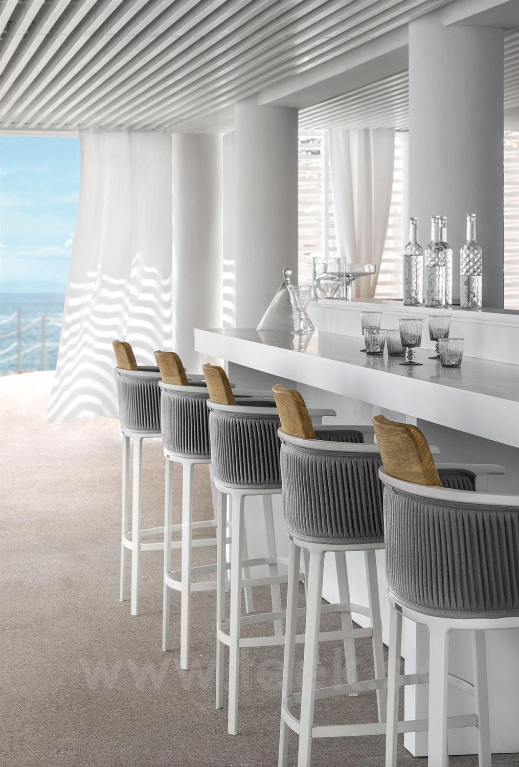 Jedálenské a barové stoličky z hliníka s opierkou z teakového dreva a vonkajšími poťahmi.