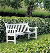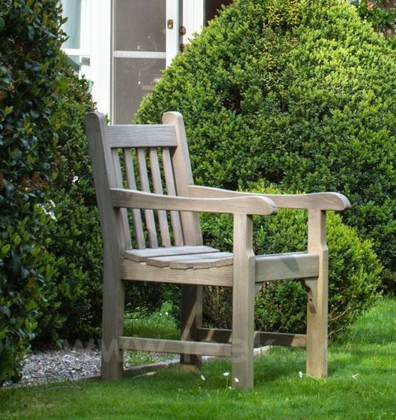 Klasické kreslá a lavice z teakového a mahagónového dreva.
