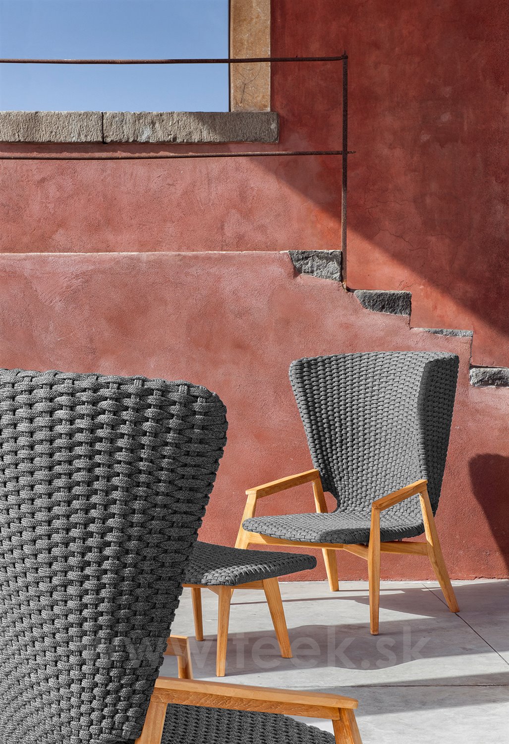 Dizajnový sedací nábytok z teakového dreva s káblovým výpletom.