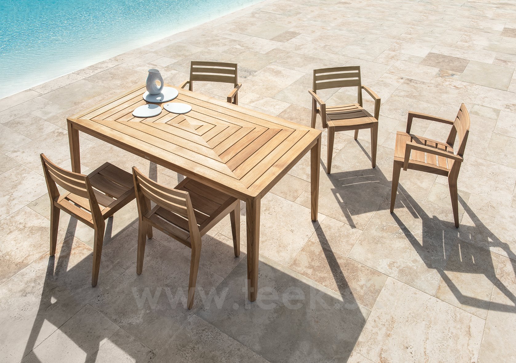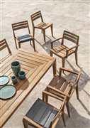 Jedálenské stoly z prírodného alebo moreného teakového dreva.