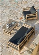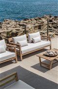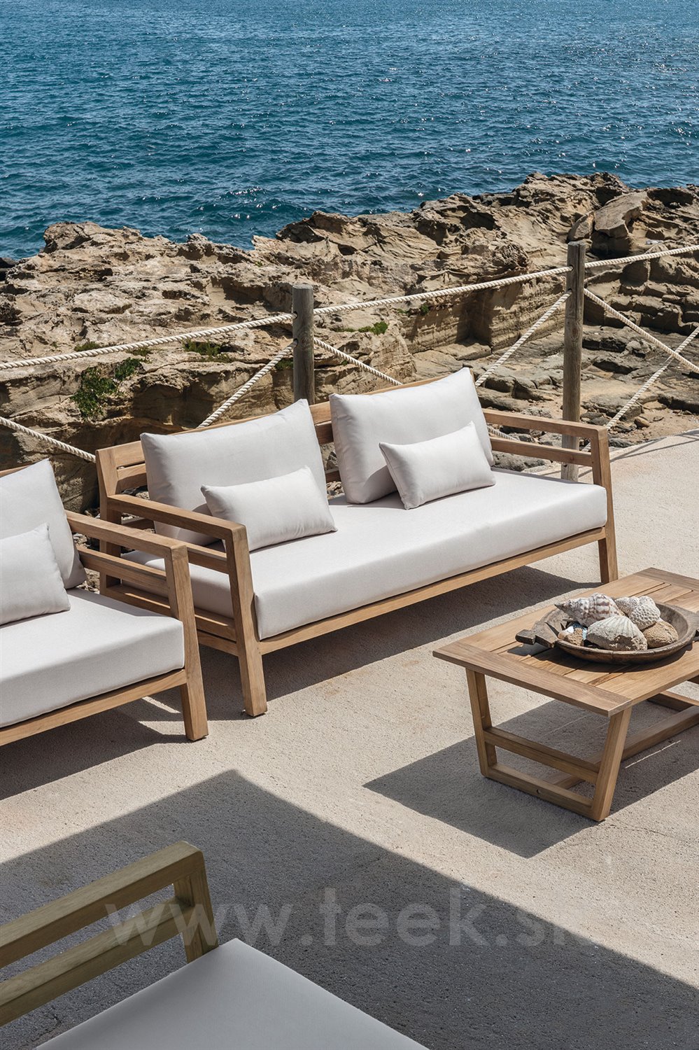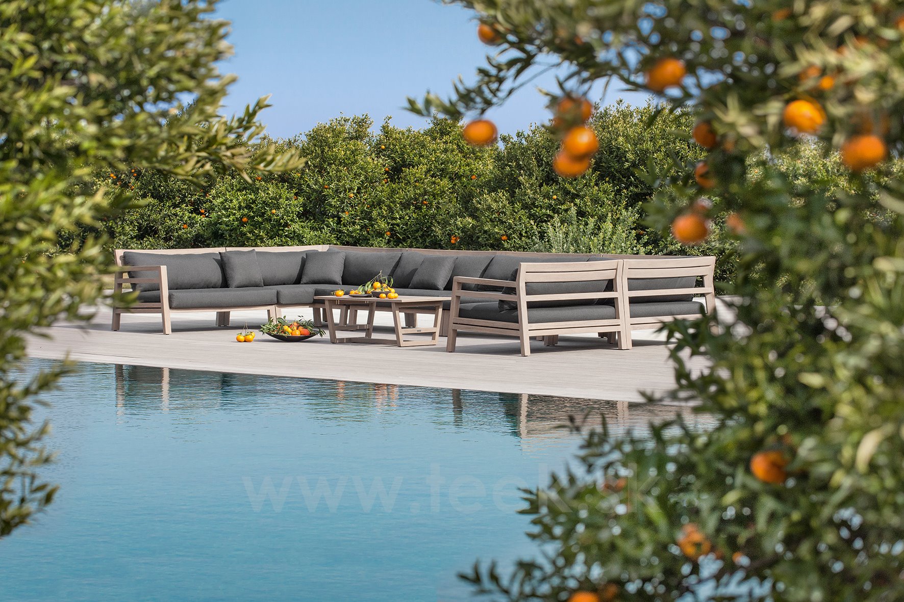 Modulárna sedacia súprava a konferenčné stoly z teakového dreva.